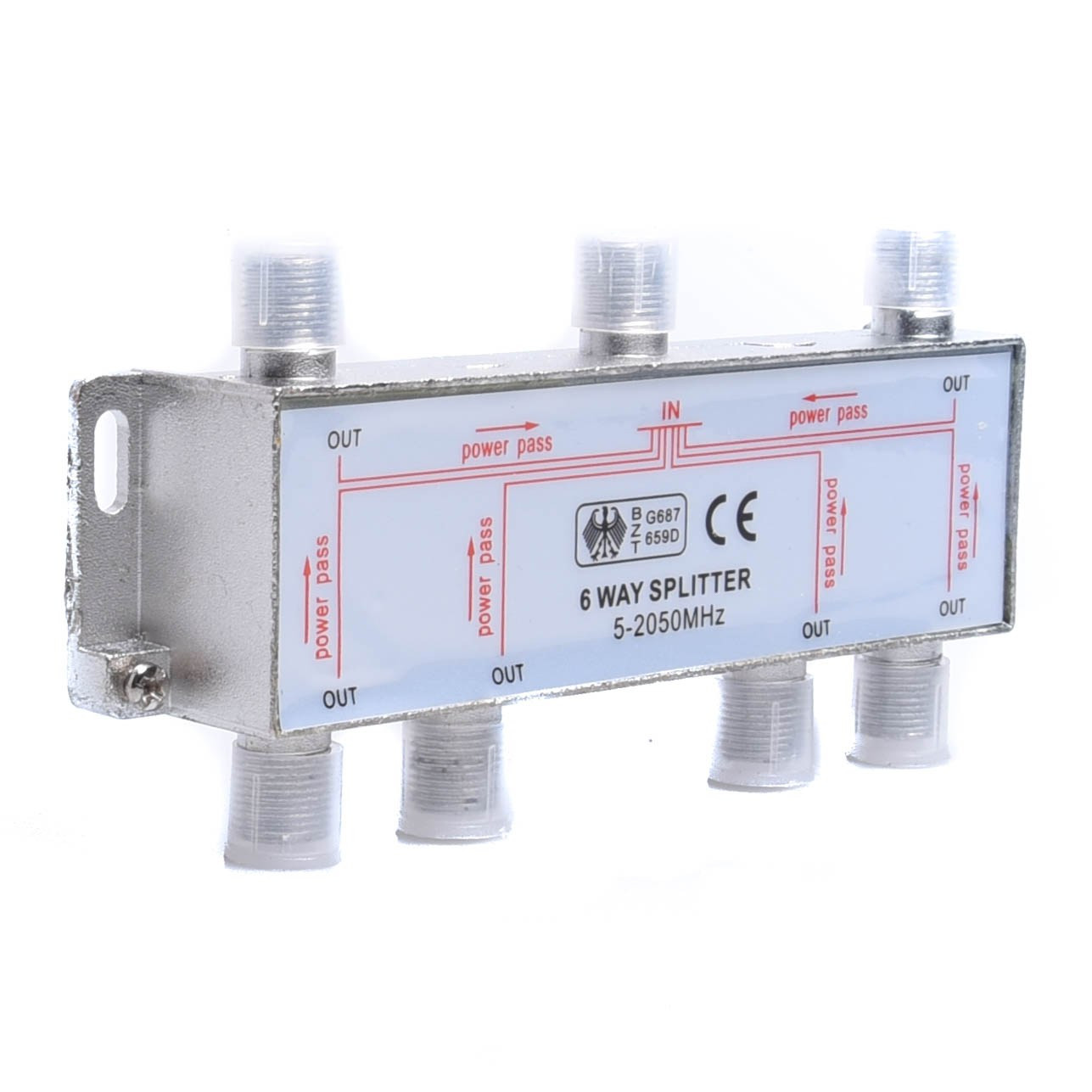 Rozdzielacz sygnału antenowego TV. 1 wejście > 6 wyjścia. Rozgałęźnik służy do rozgałęziania sygnałów radiowych i telewizyjnych w instalacjach antenowych. Umożliwia on przejście sygnałów z jednego przewodu na 6 przewodów, przy zachowaniu równomiernego podziału mocy. Korpus ze stopu cynku zapewnia ekranowanie oraz dużą odporność mechaniczną.