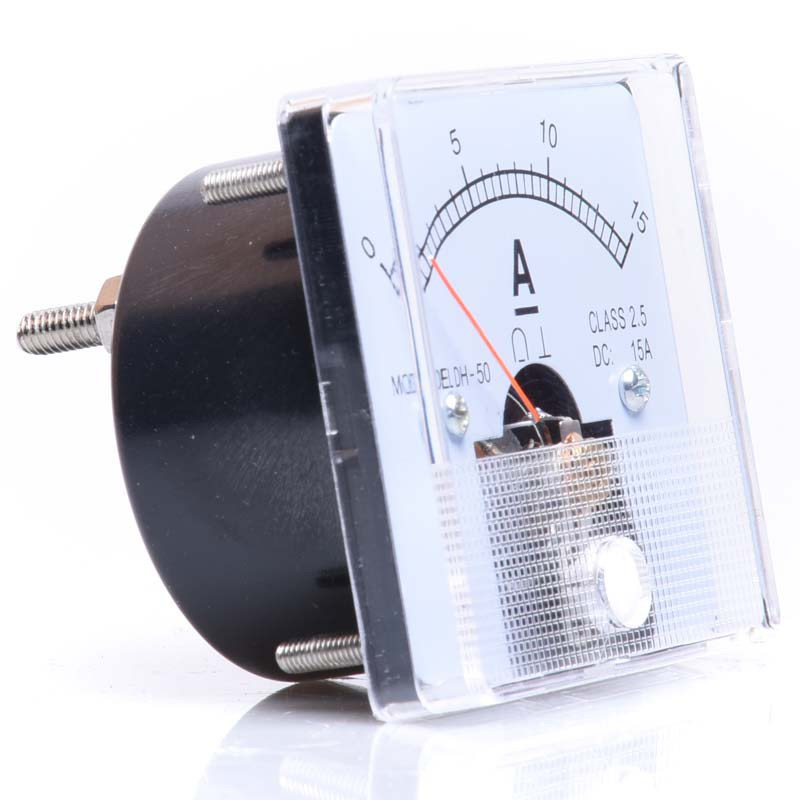 Amperomierz analogowy, panelowy, wyposażony w śrubkę do regulacji wskazówki oraz bocznik wewnętrzny do pomiarów natężenia prądu stałego rzędu 0-15A. Przewody napięciowe podłącza się do śrub konektorowych zgodnie z oznaczeniem polaryzacji. Urządzenie montowane na śruby.
