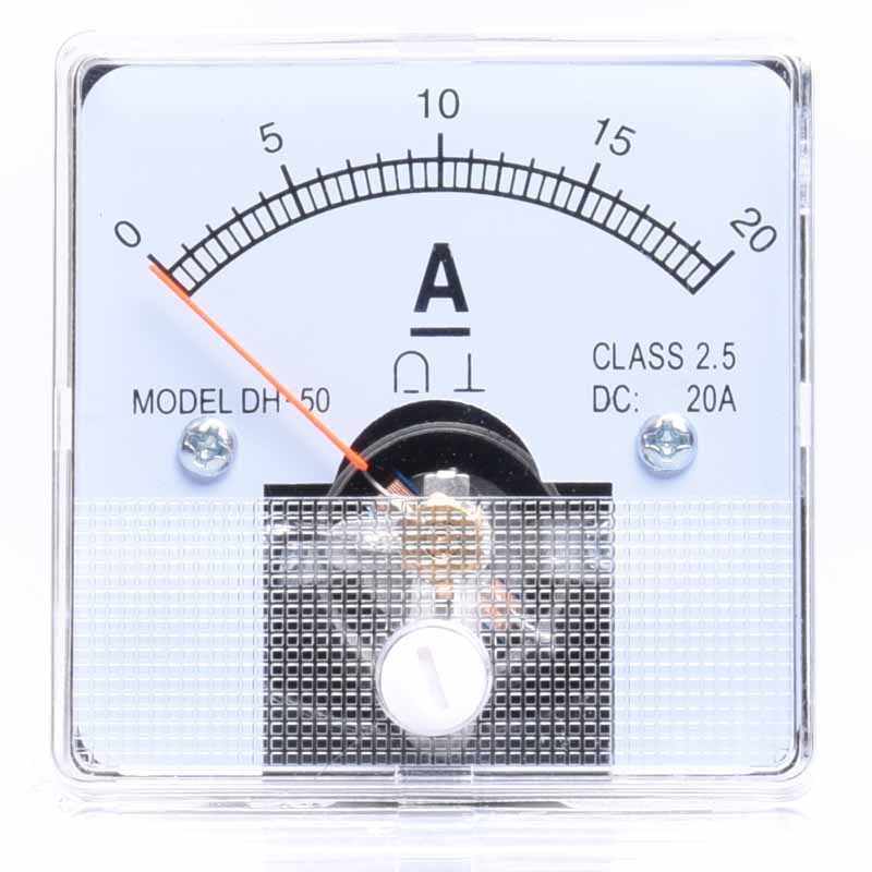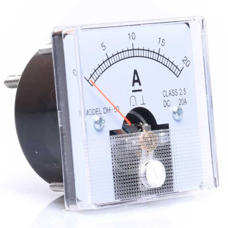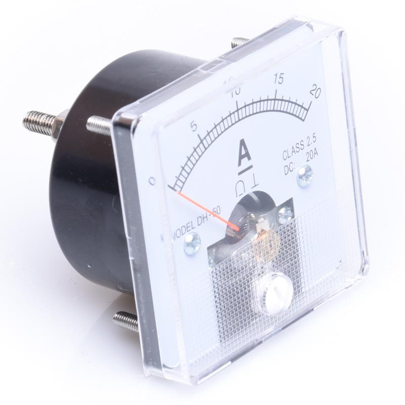 Amperomierz analogowy, panelowy, wyposażony w śrubkę do regulacji wskazówki oraz bocznik wewnętrzny do pomiarów natężenia prądu stałego rzędu 0-20A. Przewody napięciowe podłącza się do śrub konektorowych zgodnie z oznaczeniem polaryzacji. Urządzenie montowane na śruby.