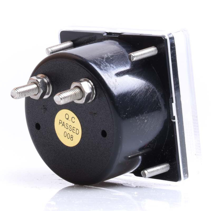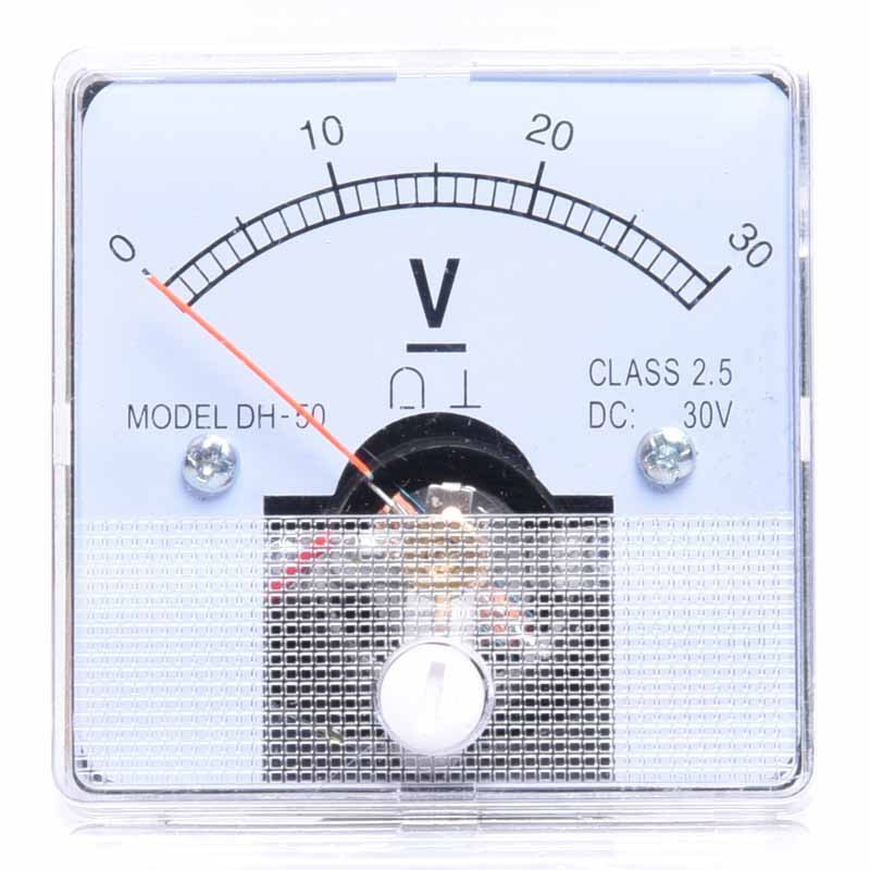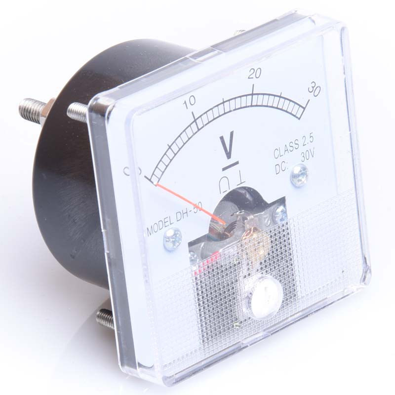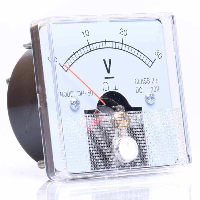 Woltomierz analogowy, panelowy, wyposażony w śrubkę do regulacji wskazówki oraz bocznik wewnętrzny do pomiarów napięcia prądu stałego rzędu 0-40V. Przewody napięciowe podłącza się do śrub konektorowych zgodnie z oznaczeniem polaryzacji. Urządzenie montowane na śruby.