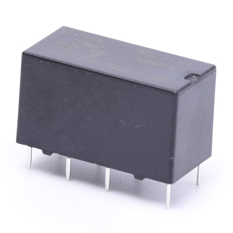 Miniaturowy przekaźnik elektromagnetyczny HONGFA HFD27-012-S (JRC27F) z cewką zasilaną napięciem 24V DC i dwoma stykami przełącznymi o maksymalnym obciążeniu do 1A przy napięciu zmiennym 125V.