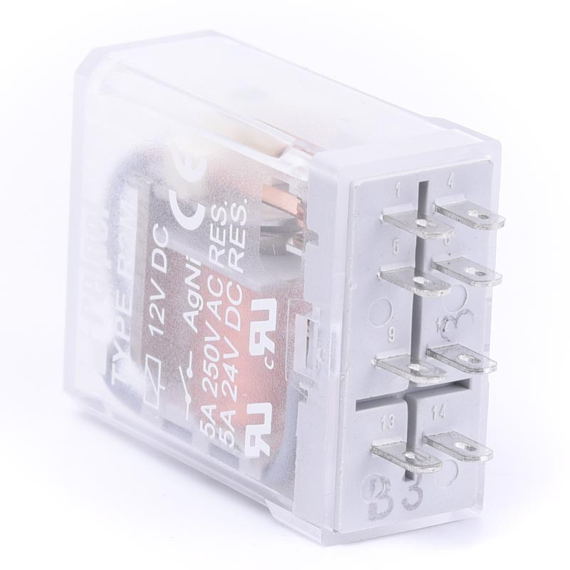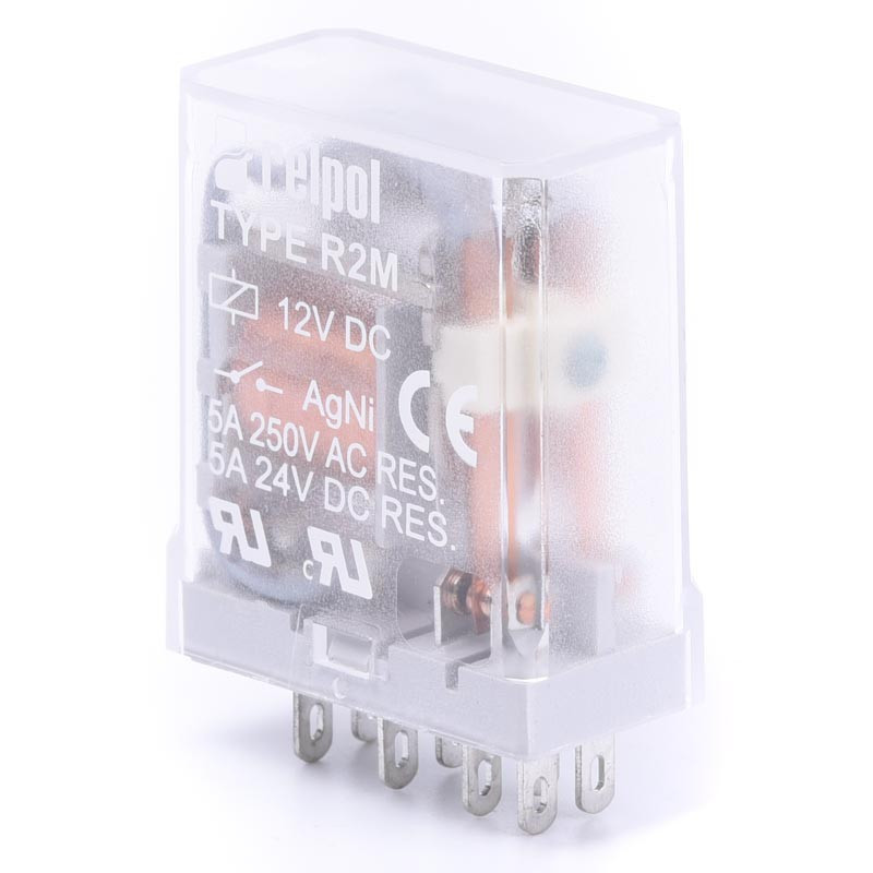 Przemysłowy przekaźnik elektromagnetyczny Relpol R2M-2012-23-1012 z serii R2M z cewką zasilaną napięciem 12V DC i dwiema parami styków przełącznych o maksymalnym obciążeniu do 5A przy napięciu zmiennym 250V.
