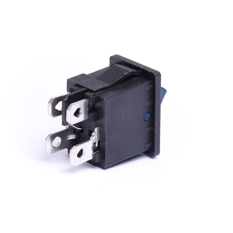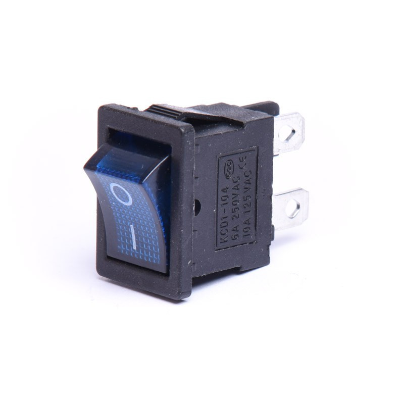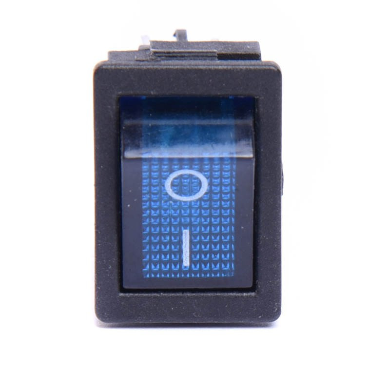 Przełącznik kołyskowy dwupozycyjny (ON-OFF) 6A/250V AC lub 10A/125V AC, mały prostokątny, niebieski, podświetlany.