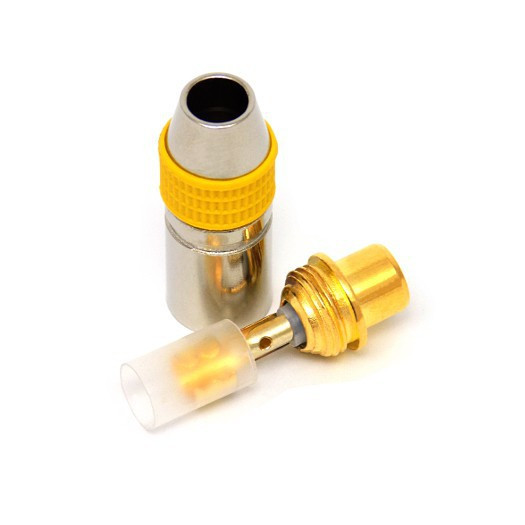 Metalowe gniazdo RCA (cinch) ze złoconymi końcówkami styków i połączeń oraz żółtą opaską. Przeznaczone do montażu na kabel o średnicy 6 mm.