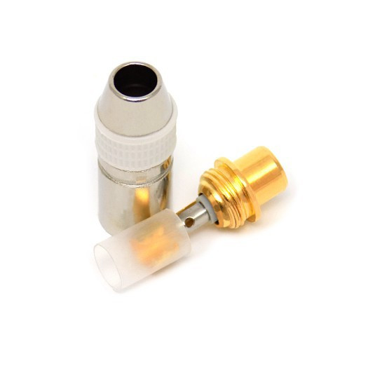 Metalowe gniazdo RCA (cinch) ze złoconymi końcówkami styków i połączeń oraz białą opaską. Przeznaczone do montażu na kabel o średnicy 6 mm.