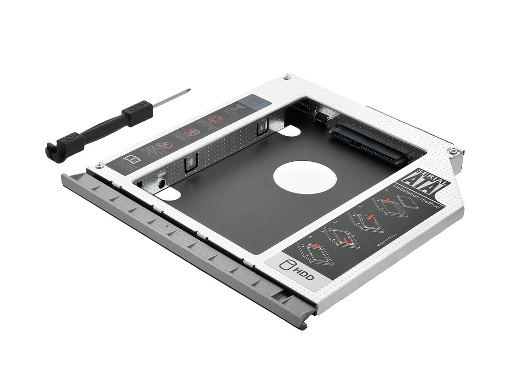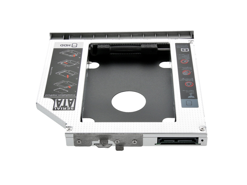 Aluminiowa, fabrycznie nowa kieszeń na dysk HDD 2.5 cala montowana w miejsce napędu optycznego komputerów przenośnych. Kieszeń umożliwia bezinwazyjną i szybką instalację drugiego dysku twardego w laptopie w miejscu napędu optycznego CD/DVD. Jest to doskonałe rozwiązanie dla użytkowników komputerów przenośnych którzy potrzebują dodatkowego dysku twardego w swoim laptopie. Technologia podłączenia typu Plug and Play umożliwia zainstalowanie kieszeni bez użycia sterowników i dodatkowego oprogramowania. Dodatkową zaletą jest możliwość bootowania z dysku zamontowaniego w kieszeni.