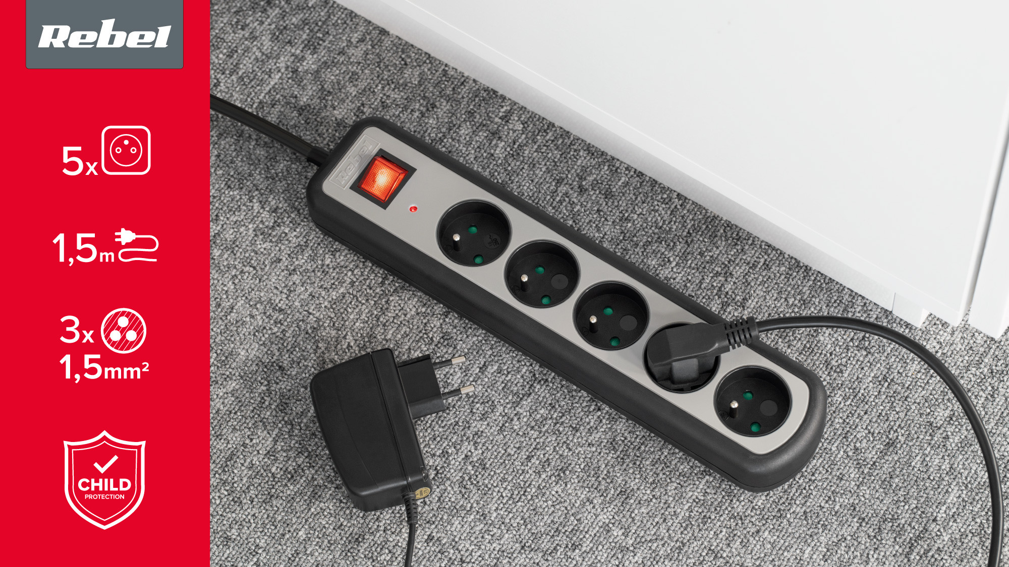 Listwa zasilajaca Rebel 5 gniazd z przełacznikiem, 1,5m (1,5mm)
