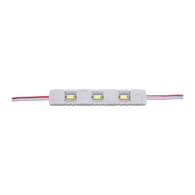 Moduł LED 3 diodowy oparty na mocnych diodach SMD 5630 jest wysokiej jakości produktem dedykowanym do oświetlenia: banerów, kasetonów reklamowych, ekspozycji sklepowych, mebli, półek, schodów, ogrodów, akwariów itd. Dzięki szczelnej obudowie (IP68), może być stosowany wewnątrz jak i na zewnątrz. Moduły można łączyć w dowolnie długie odcinki, gdzie ograniczeniem jest jedynie moc podłączonego do nich zasilacza. Dzięki zastosowaniu przewodów łączących moduły (maksymalnie 20 sztuk w ciągu), można oświetlić elementy o nietypowych kształtach.