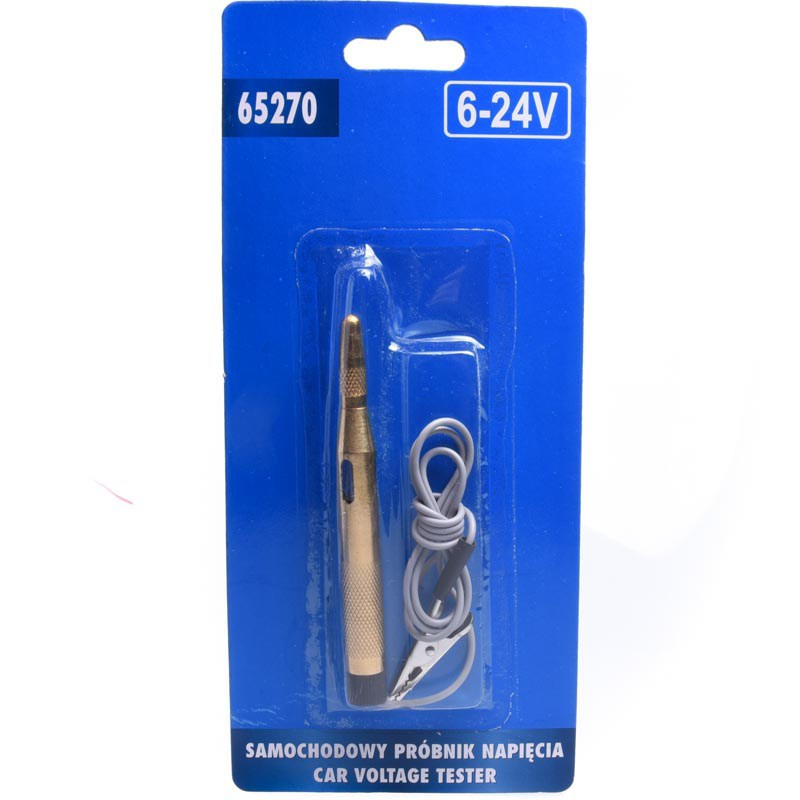 Samochodowy próbnik napięcia 65270, przeznaczony do pomiaru napięcia w pojazdach. Narzędzie służące do wyszukiwania miejsc pod napięciem, przerw w przewodach, testowania bezpieczników i gniazd świateł. Zakres pomiarowy próbnika to 6-24V. Narzędzie wyposażone jest w przewód z krokodylkiem.