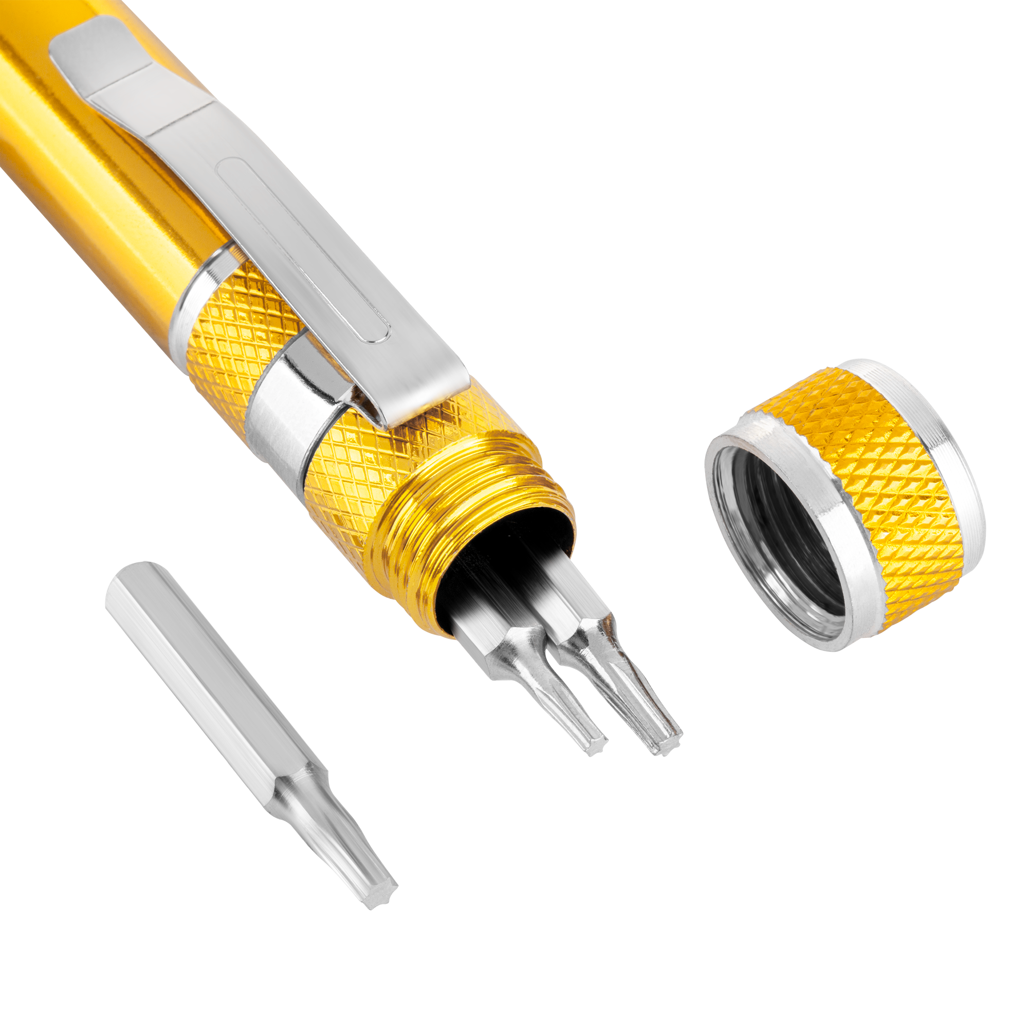 Kieszonkowy wkrętak precyzyjny to przydatne akcesorium nie tylko dla majsterkowiczów. Z powodzeniem sprawdzi się np. do wymiany baterii w zabawkach elektronicznych i innych naprawach. Niewielkie rozmiary sprawiają, że można go łatwo schować do torebki, a kształt długopisu z dodatkowym klipsem pozwala zaczepić produkt do kieszeni koszuli lub spodni, by mieć go pod ręką w każdej sytuacji.