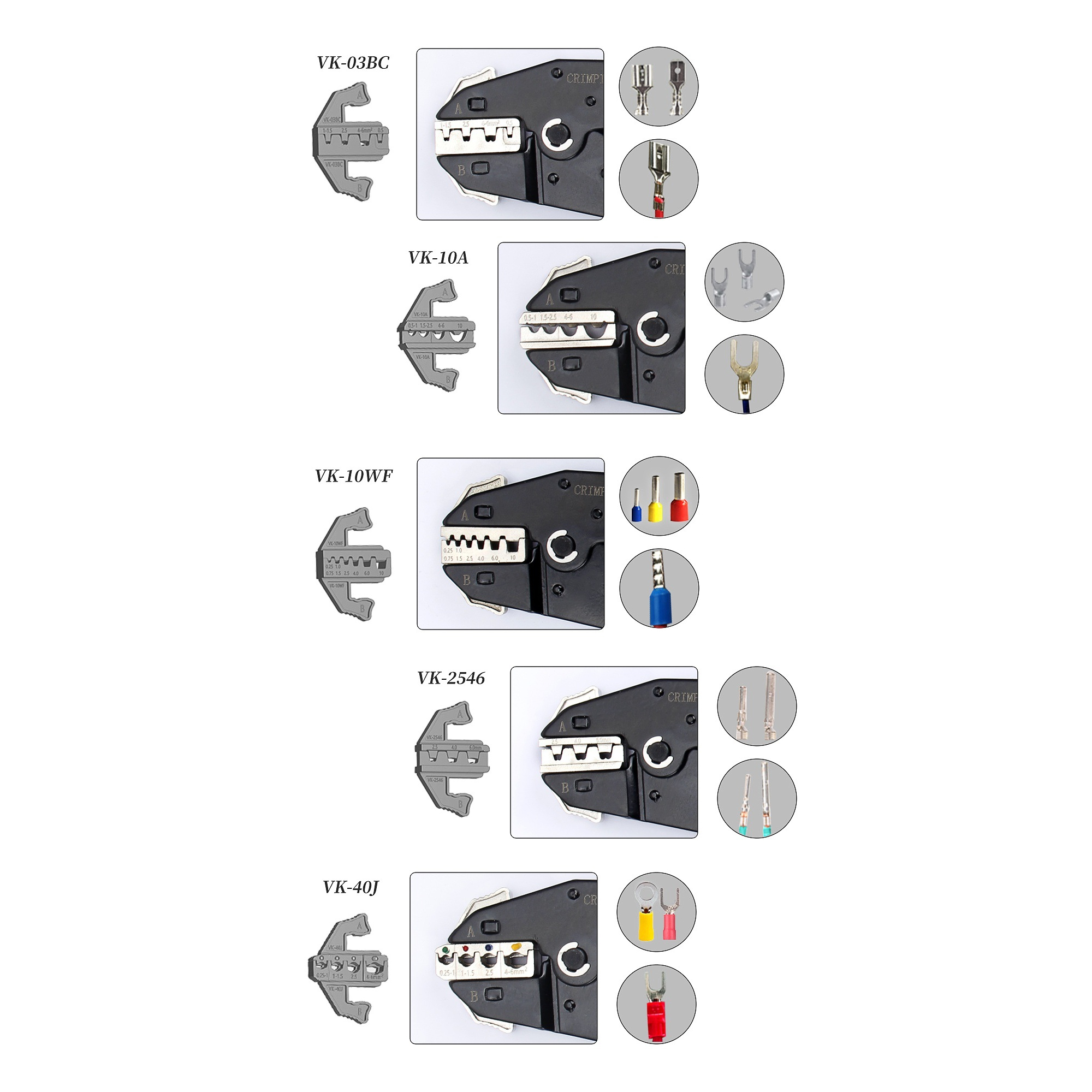 ??VK-40J: Dla 0,25 - 6mm2(23-10AWG) - Do złączy termokurczliwych, końcówek izolowanych i końcówek nylonowych.