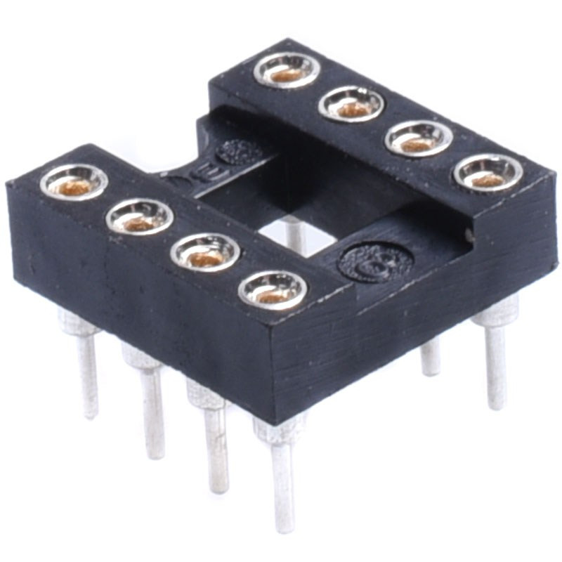 Wąska podstawka precyzyjna pod układy scalone DIL 8. Podstawka posiada dwustronną blaszkę dociskową, przeznaczona do układów scalonych w obudowach DIL8.