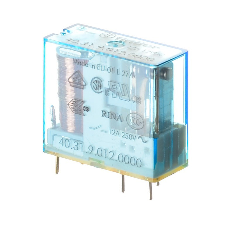 Wysokiej jakości przekaźnik Finder 40.31.9.012.0000. Napięcie nominalne cewki 12V DC (stały) monostabilny , 1 cewka, 1 zestyk przełączny. Przekaźnik montowany w druk, w płytkę drukowaną do lutowania.