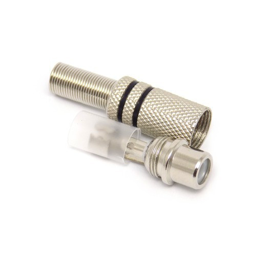 Metalowe gniazdo typu RCA (cinch) z czarną opaską do montażu na kabel o średnicy 6 mm.