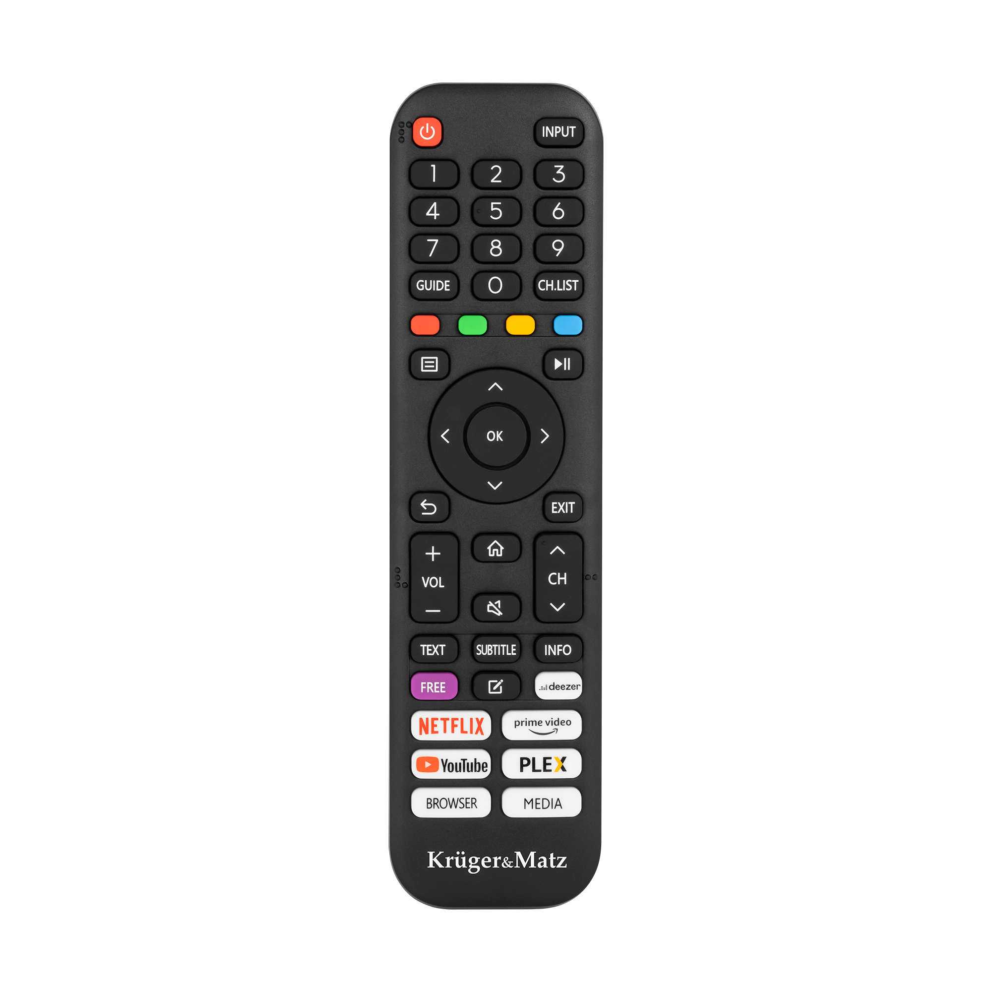 Dołączony do telewizora Kruger&Matz pilot został zaprojektowany z myślą o wygodnym i intuicyjnym użytkowaniu. Na pilocie znajdują się skróty do najpopularniejszych aplikacji, takich jak Netflix, YouTube czy Amazon Prime Video. Dzięki nim możesz szybko uruchomić ulubione treści bez konieczności przeglądania menu czy wyszukiwania aplikacji.