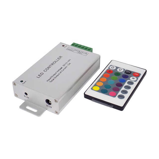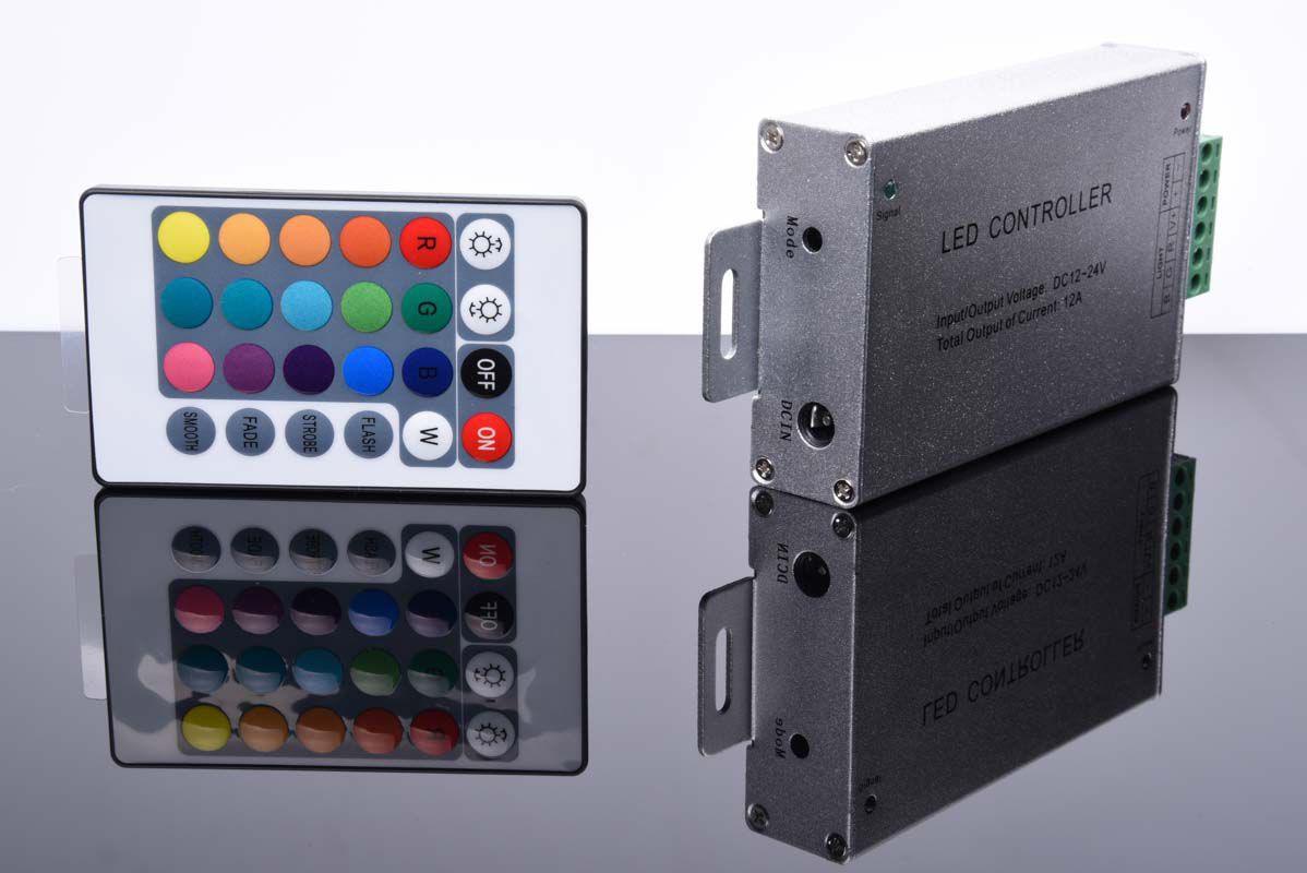 W tym niewielkim urządzeniu zintegrowano zaawansowany kontroler sterowany 24 przyciskowym pilotem na podczerwień. Sterownik pozwala na sterowanie kolorami w źródłach światła LED RGB. W palecie funkcji znajdują się takie opcje jak zmiana natężenia, statyczne ustawienia kolorów, automatyka zmiany kolorów. Zmiana sekwencji (+RGB,+GRB,+BRG) odbywa się w sposób płynny. Komunikacja miedzy pilotem a sterownikiem odbywa się za pomocą fal podczerwonych IR. Rozwiązanie to umożliwia obsługę kilku identycznych urządzeń jednym pilotem.