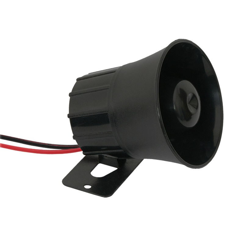 Syrena alarmu samochodowego, jednotonowa. Posiada dwa przewody do podłączenia do zasilania.