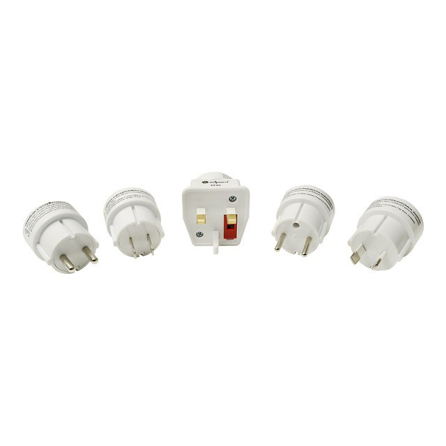 Zestaw różnych adapterów zasilania, umożliwiający podłączenie urządzeń elektrycznych w krajach korzystających z europejskiego/amerykańskiego/australijskiego lub brytyjskiego systemu gniazd sieciowych.