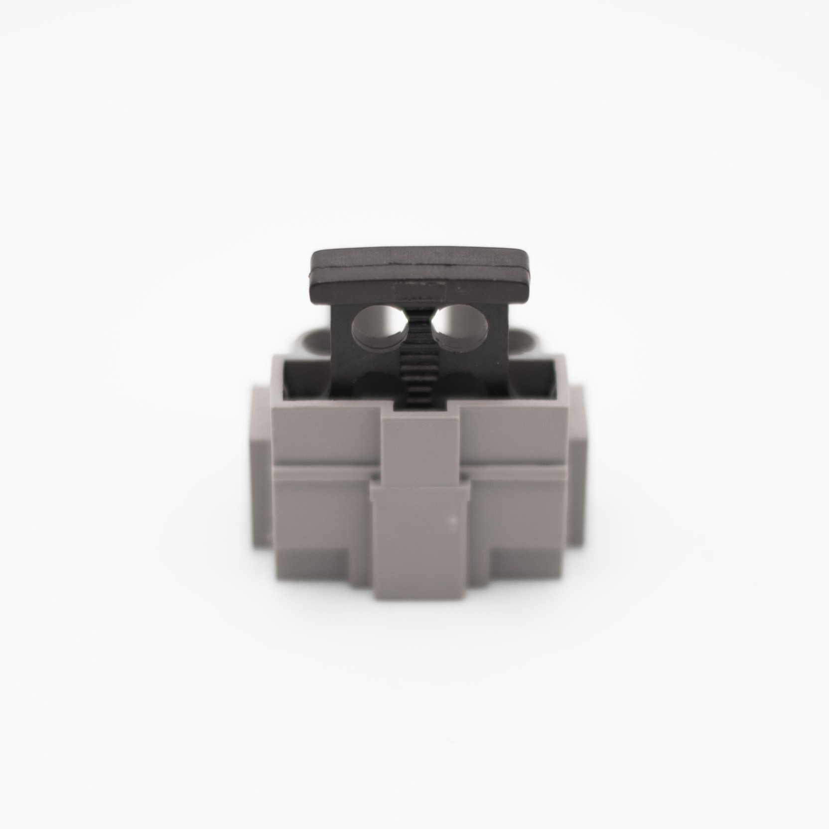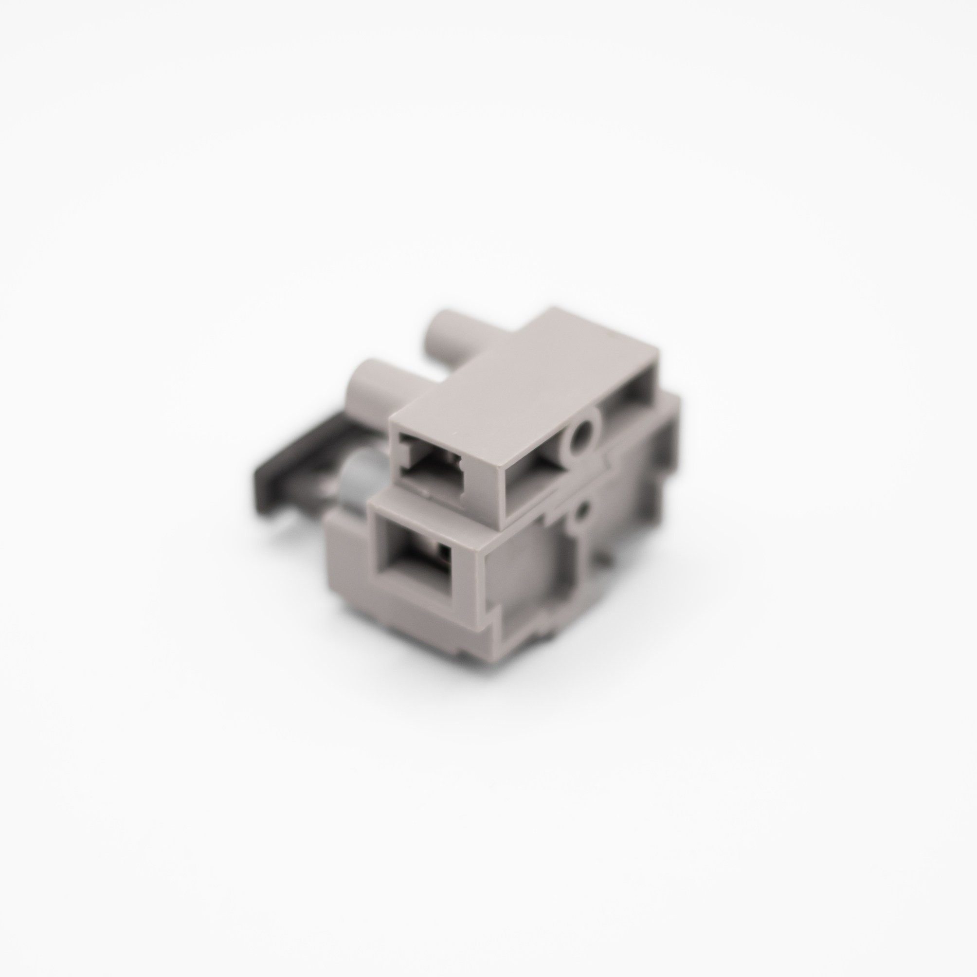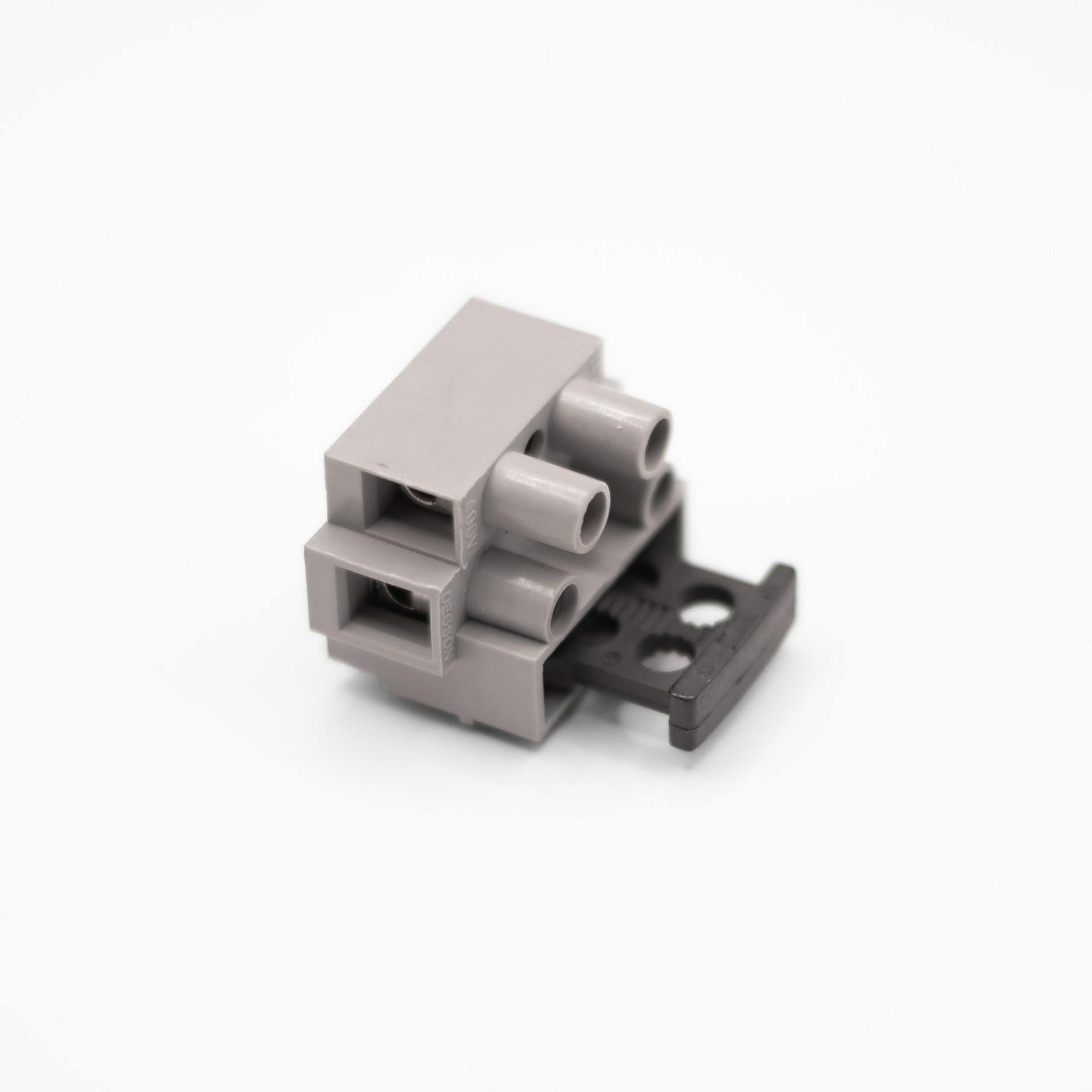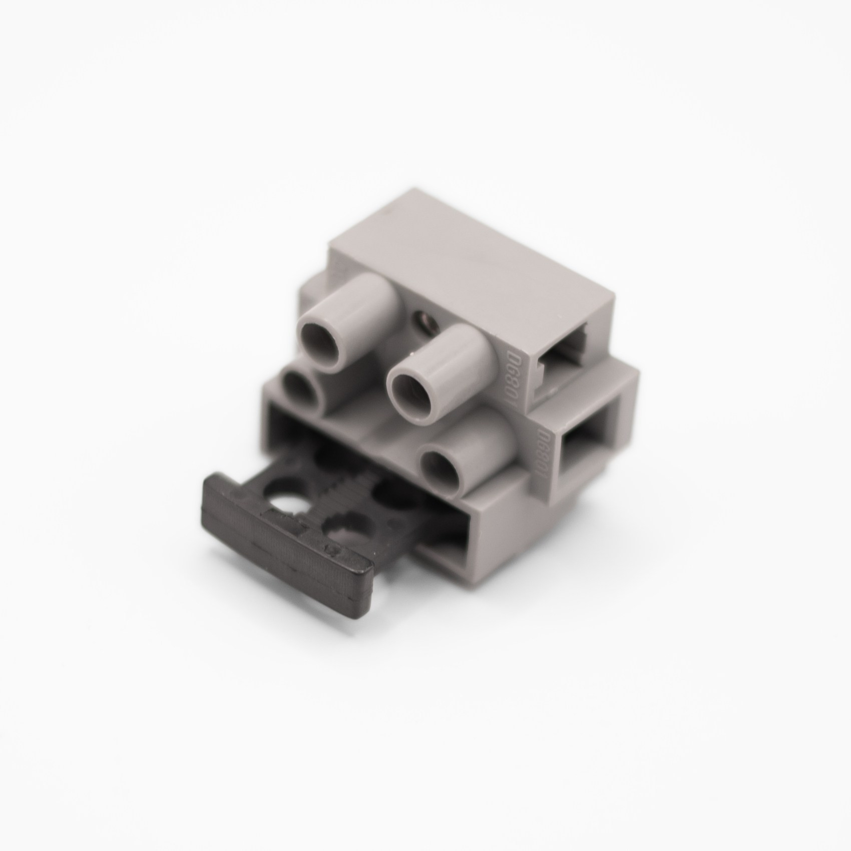 Listwa zaciskowa 2-torowa z wbudowanym gniazdem bezpiecznika, przeznaczona do bezpiecznego łączenia przewodów elektrycznych z możliwością łatwej wymiany bezpiecznika.
