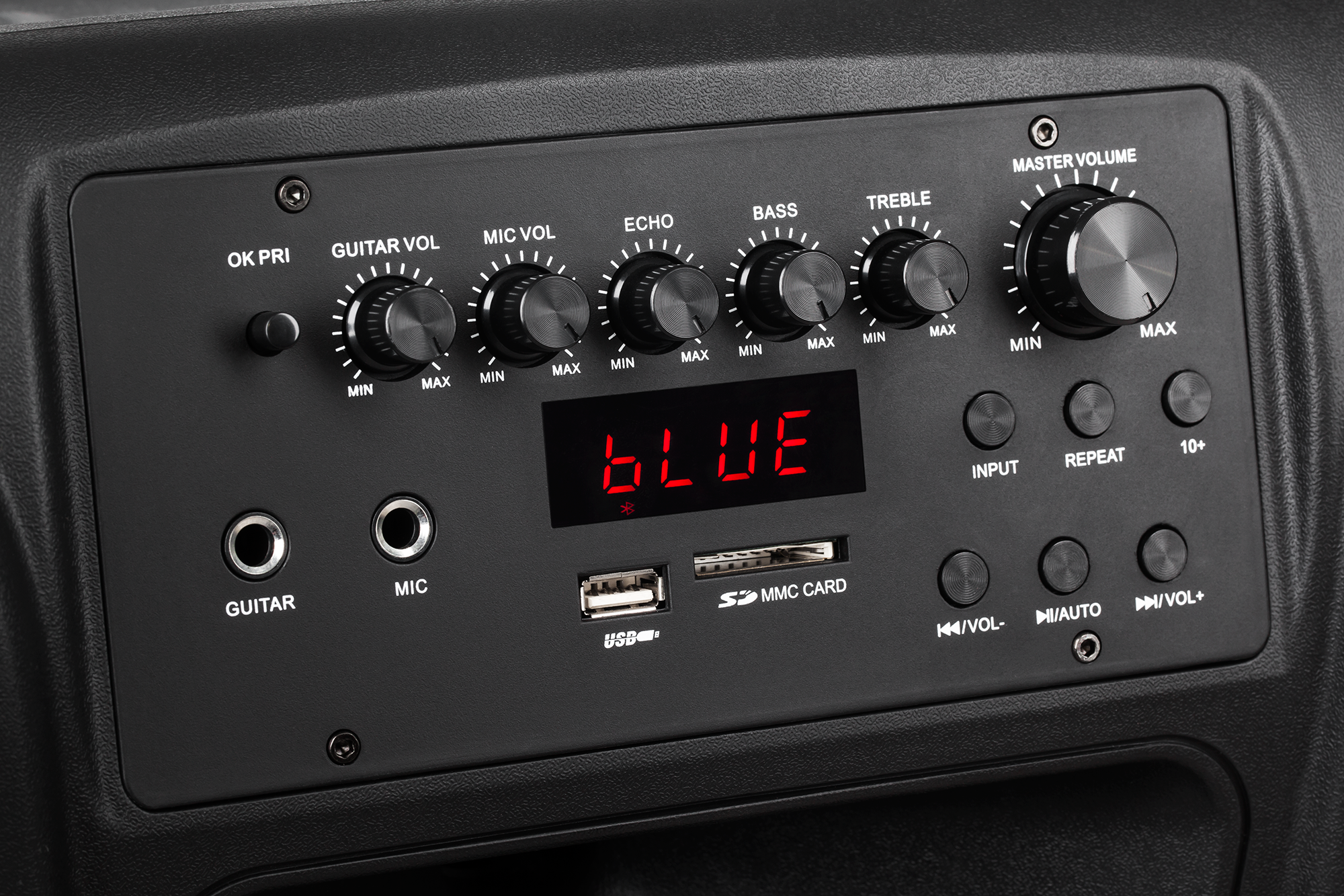 Zwróciłeś uwagę na szereg pokręteł znajdujących się na panelu sterującym kolumny? Pozwalają one nie tylko na dostosowanie głośności muzyki, mikrofonów i gitary, ale także umożliwiają regulację pogłosu oraz tonów niskich i wysokich.