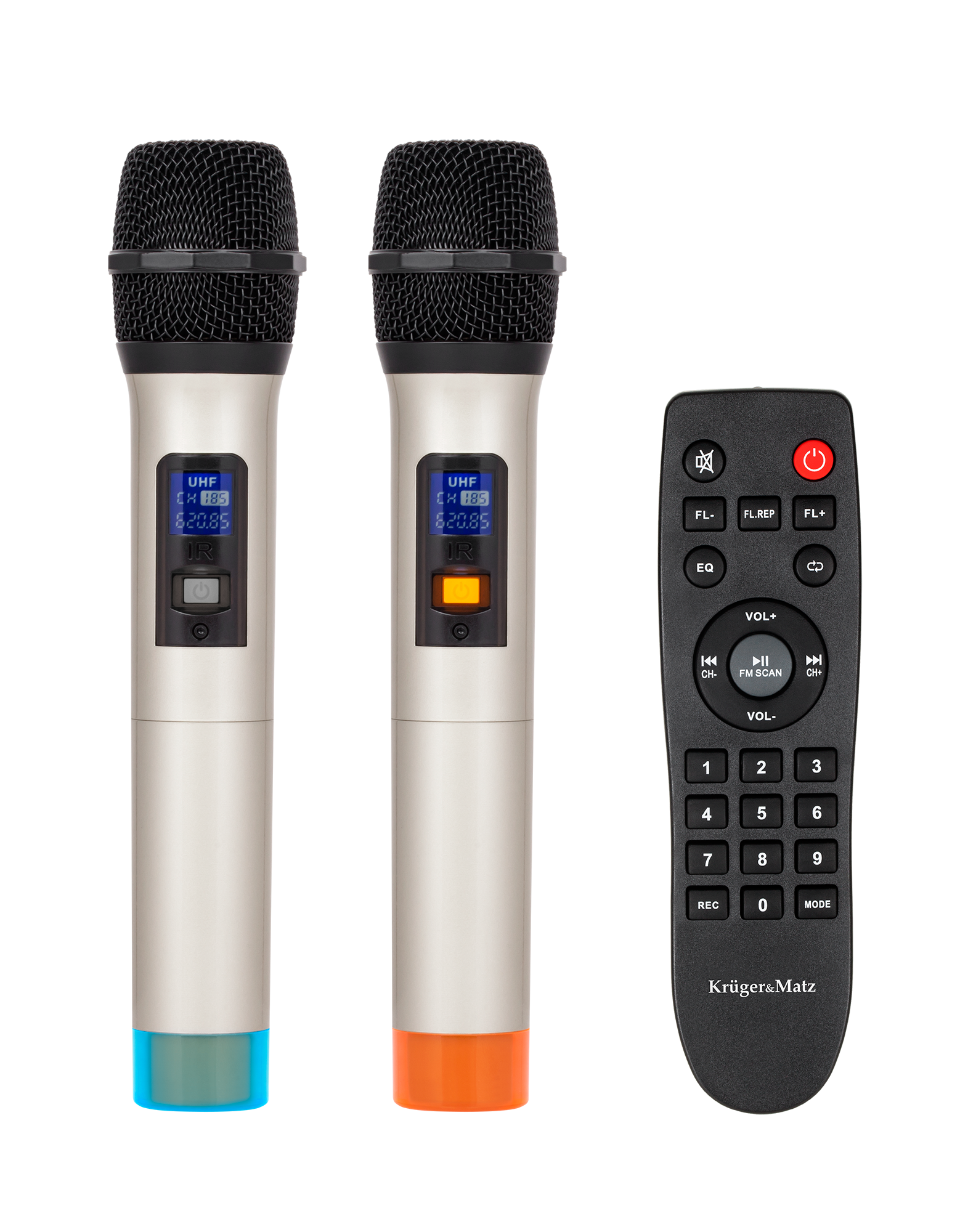 W zestawie: 2 mikrofony bezprzewodowe, pilot zdalnego sterowania