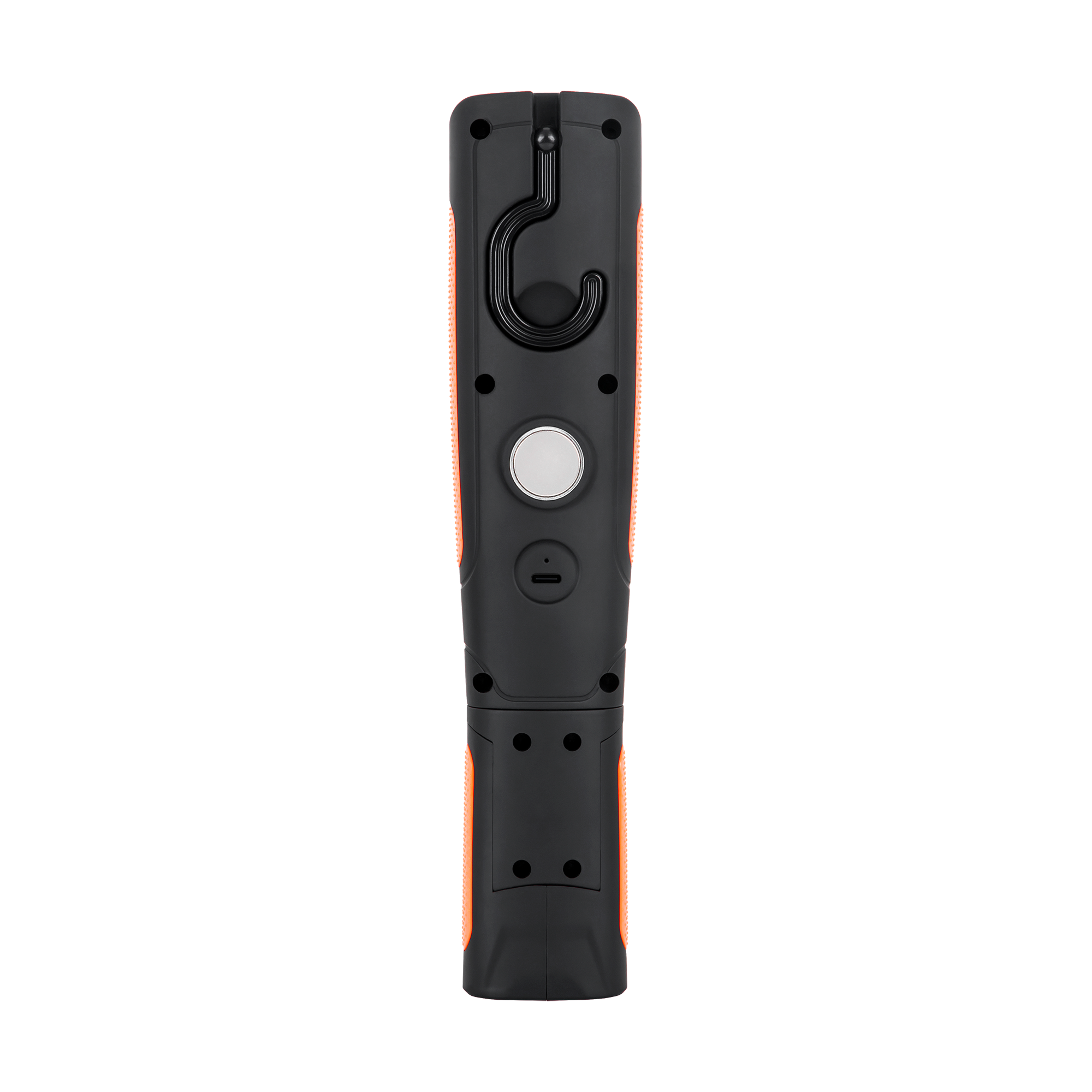 Lampa wyposażona jest w hak do zawieszenia oraz dwa magnesy, które umożliwiają jej łatwe mocowanie w dowolnym miejscu. Obrotowy uchwyt 360° oraz składana podstawka 180° pozwalają na precyzyjne skierowanie światła tam, gdzie jest potrzebne, zapewniając pełną swobodę podczas pracy.