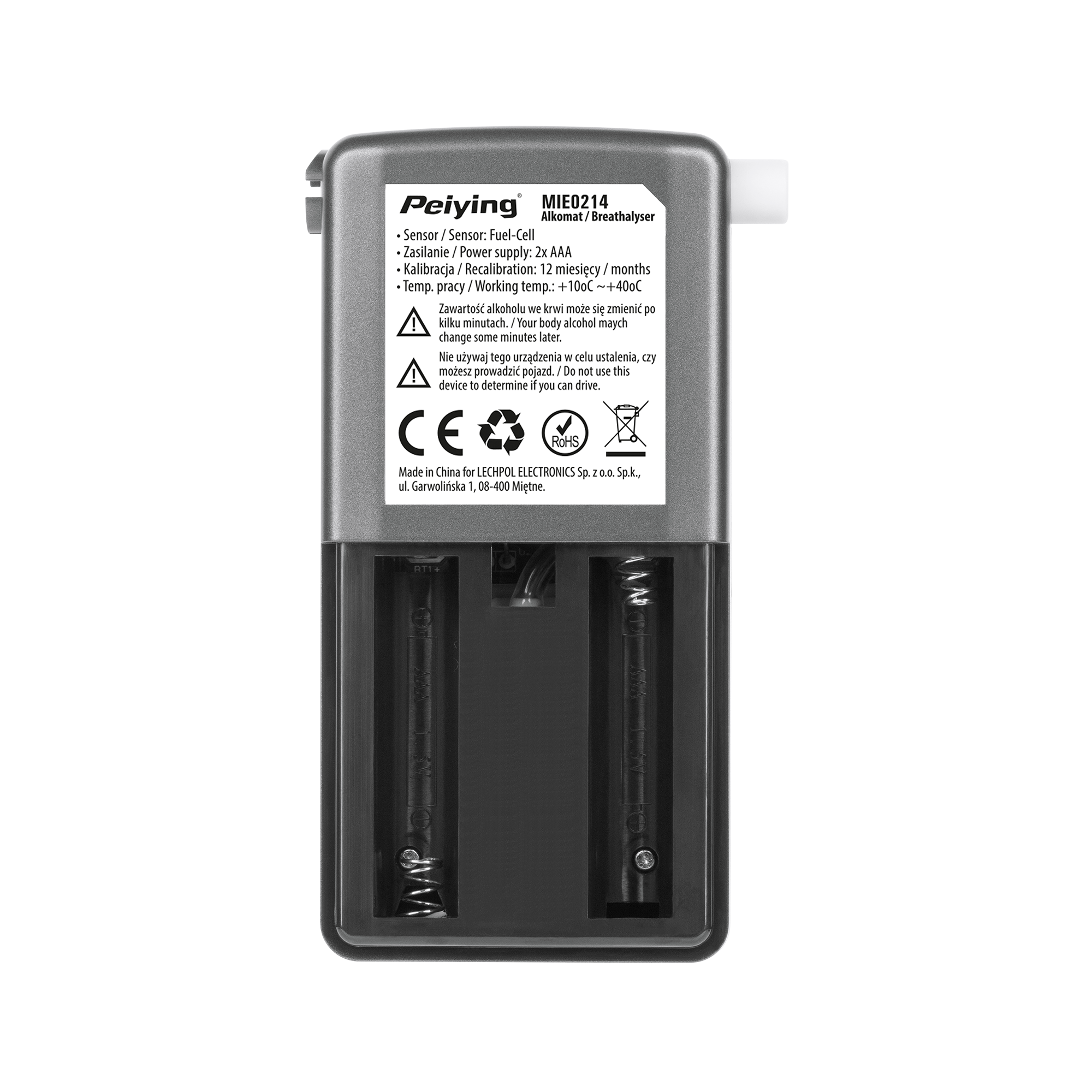 Nowej generacji sensor elektrochemiczny w alkomacie Peiying KT-571 w połączeniu szeroką funkcjonalnością gwarantują precyzyjny odczyt z dokładnością do 0,005%. Dodatkową zaletą urządzenia jest możliwość zmiany jednostek pomiarowych na %, ‰ lub mg/L oraz funkcja zapamiętywania ostatnich pięciu pomiarów.