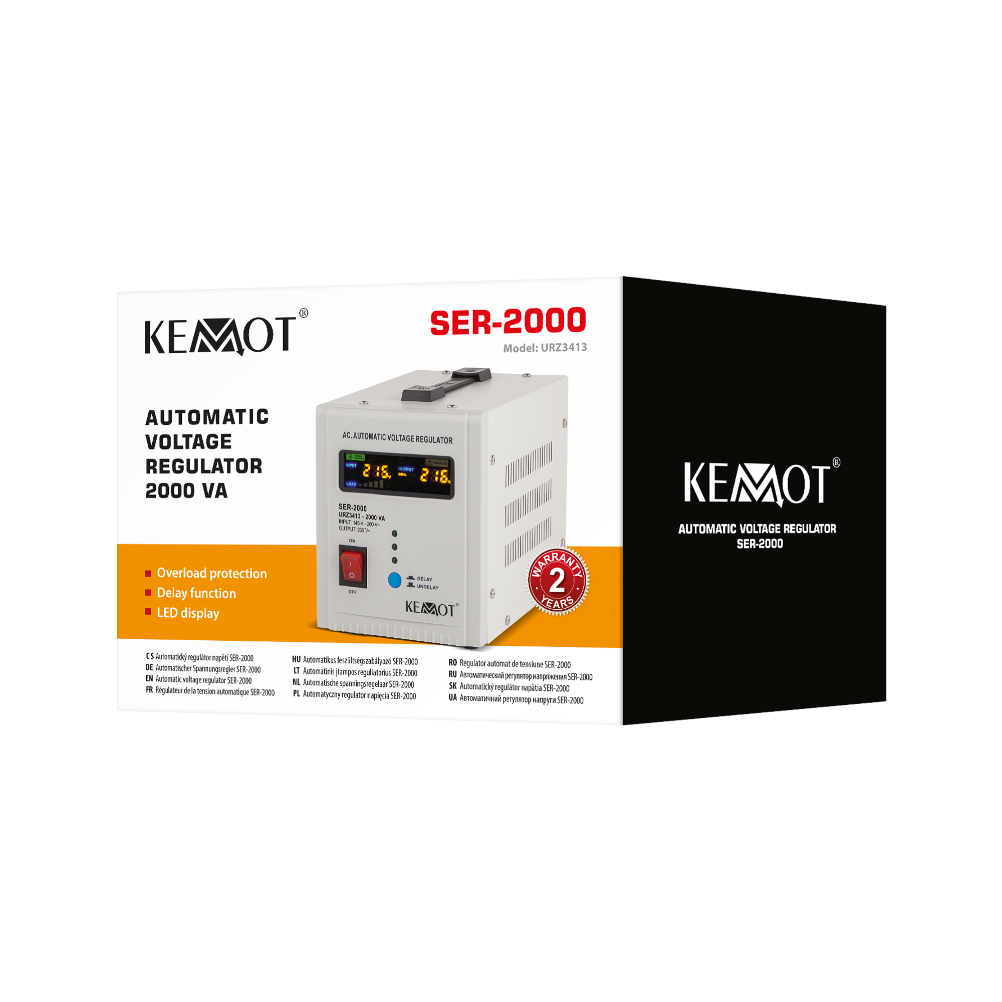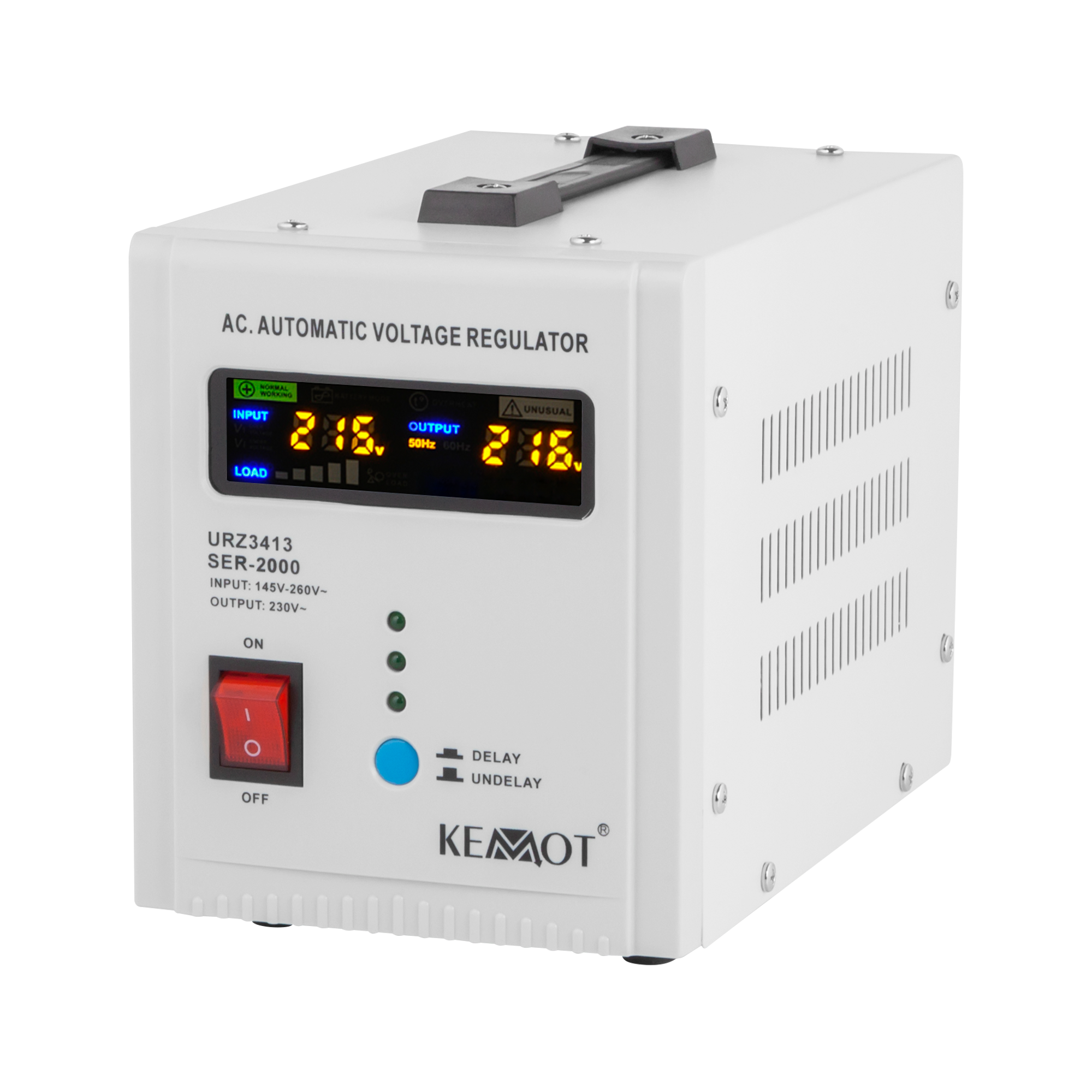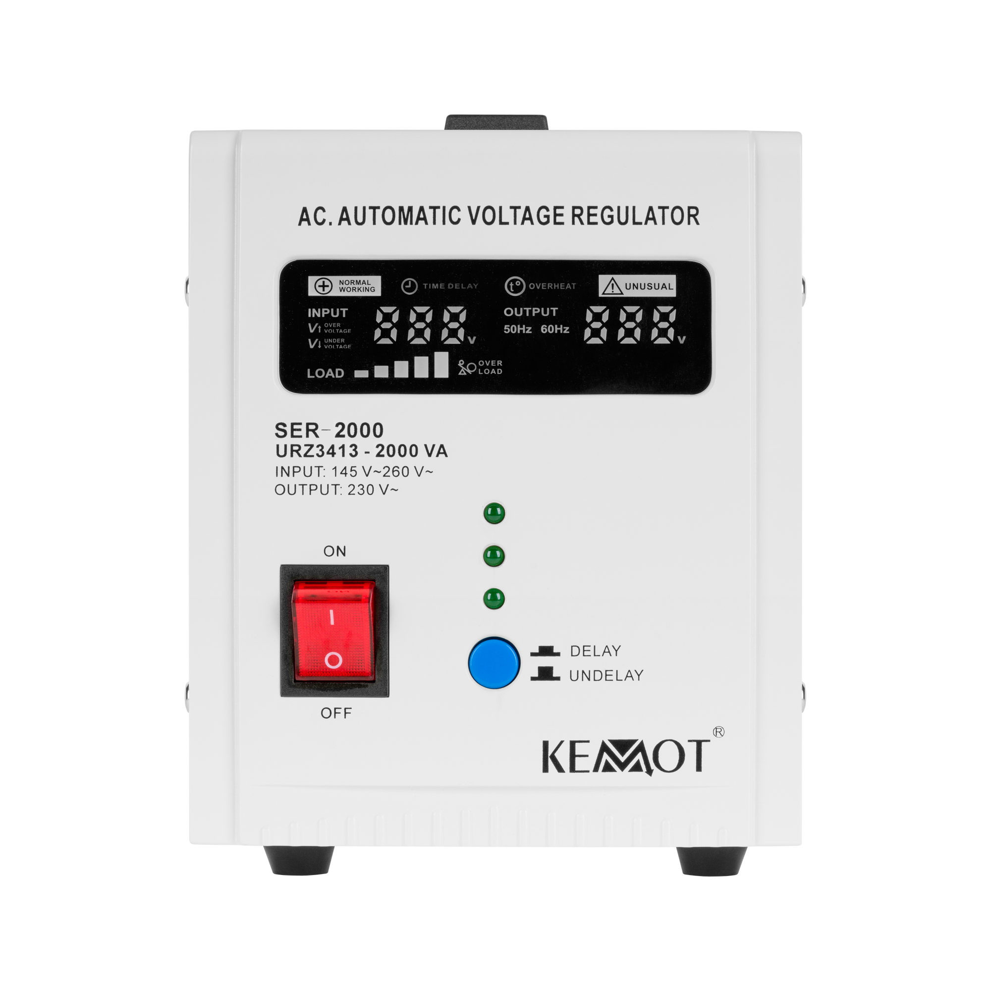 Jeśli potrzebujesz stabilizatora napięcia do urządzeń posiadających duży chwilowy prąd rozruchowy wybierz model wyposażony w funkcję opóźnienia załączenia DELAY. KEMOT SER-2000, został wyposażony w przycisk opóźnienia załączania DELAY w zakresie od 6 do 180 sekund, co obniży ryzyko jego uszkodzenia, gdy podłączone do niego urządzenia mają duży chwilowy prąd rozruchowy. Ponadto stabilizator SER-2000 posiada zabezpieczenia przed zbyt wysokim i niskim napięciem, przeciążeniem, przegrzaniem i zwarciem.