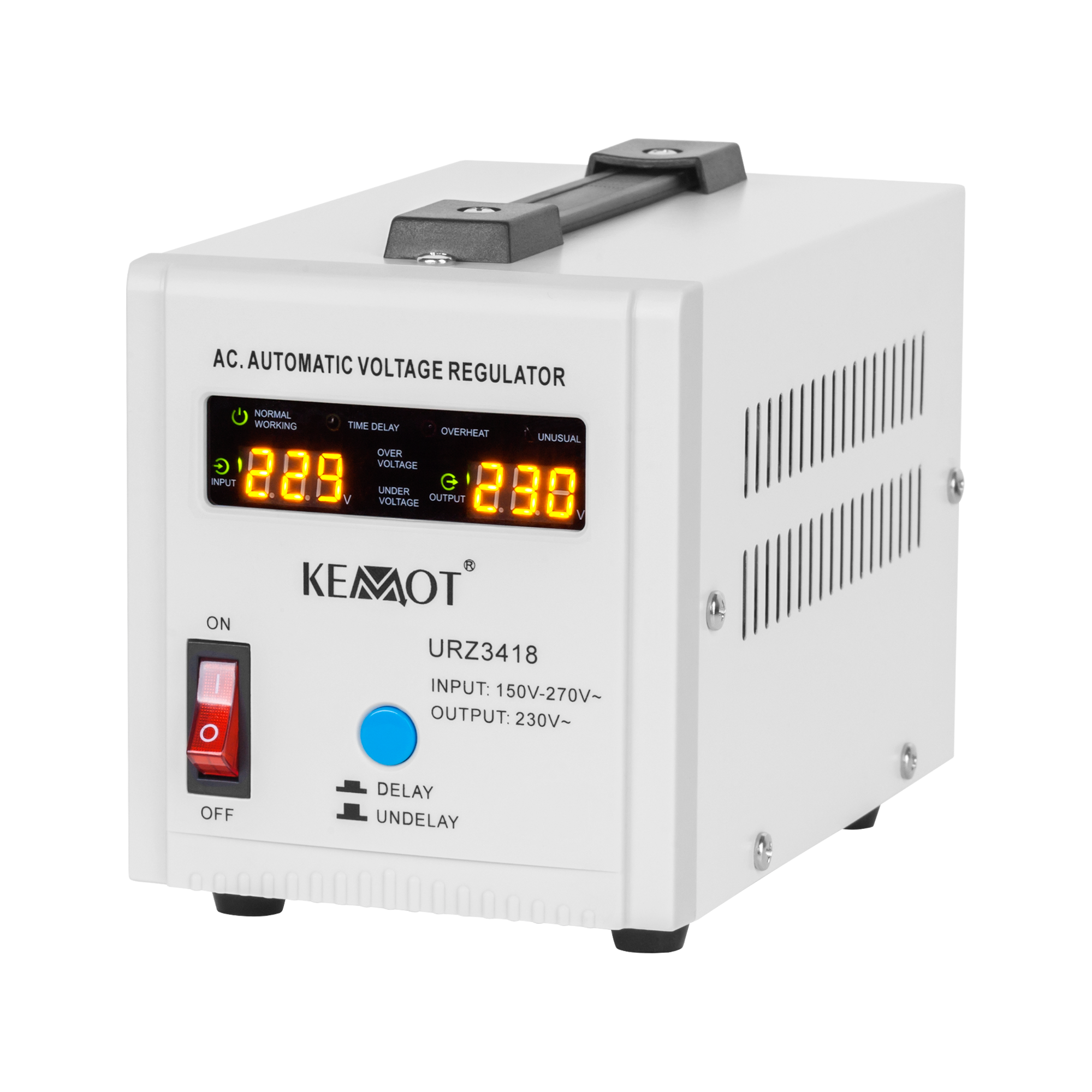 Jeśli potrzebujesz stabilizatora napięcia do urządzeń posiadających duży chwilowy prąd rozruchowy wybierz model wyposażony w funkcję opóźnienia załączenia DELAY. KEMOT SER-500, został wyposażony w przycisk opóźnienia załączania DELAY w zakresie od 6 do 180 sekund, co obniży ryzyko jego uszkodzenia, gdy podłączone do niego urządzenia mają duży chwilowy prąd rozruchowy. Ponadto stabilizator SER-500 posiada zabezpieczenia przed zbyt wysokim i niskim napięciem, przeciążeniem, przegrzaniem i zwarciem.