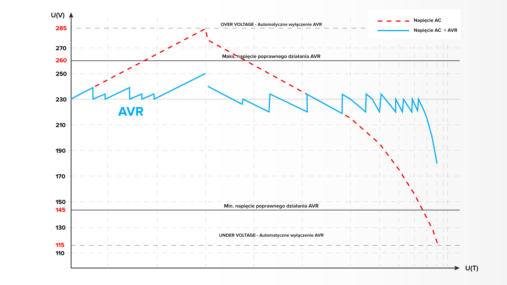Zabezpieczenia: przed zbyt wysokim i niskim napięciem, przeciążeniem, przegrzaniem, zwarciem