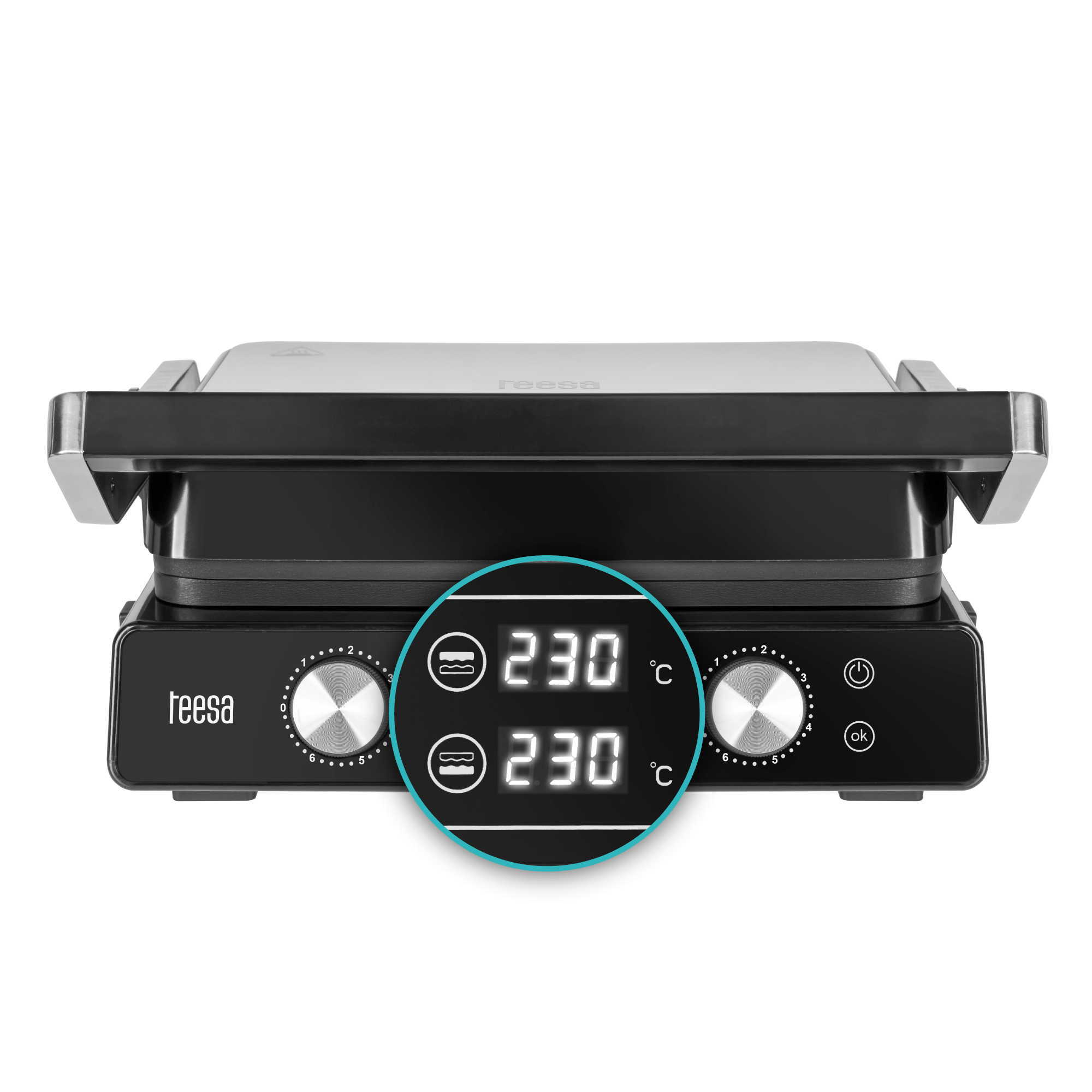 Dzięki aż 7 pozycjom ustawienia płyt, panini grill Teesa pozwala precyzyjnie dopasować tryb grillowania do rodzaju potrawy – od cienkich kromek chleba po wysokie burgery czy warzywne szaszłyki. Możesz używać go jako klasycznego grilla kontaktowego, otwartego grilla stołowego czy opiekacza do kanapek. Regulacja kąta sprawia, że jedzenie jest opiekane równomiernie, a jego tekstura pozostaje idealna.