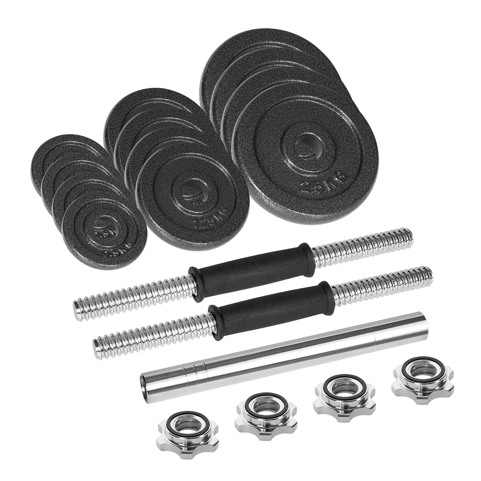 W zestawie znajdziesz 12 żeliwnych talerzy: 4 x 0,5 kg, 4 x 1,25 kg i 4 x 2,5 kg. Dzięki temu łatwo dobierzesz odpowiednie obciążenie do każdego ćwiczenia – niezależnie od poziomu zaawansowania. To idealne rozwiązanie do treningu siłowego w domu – elastyczne i bezpieczne.