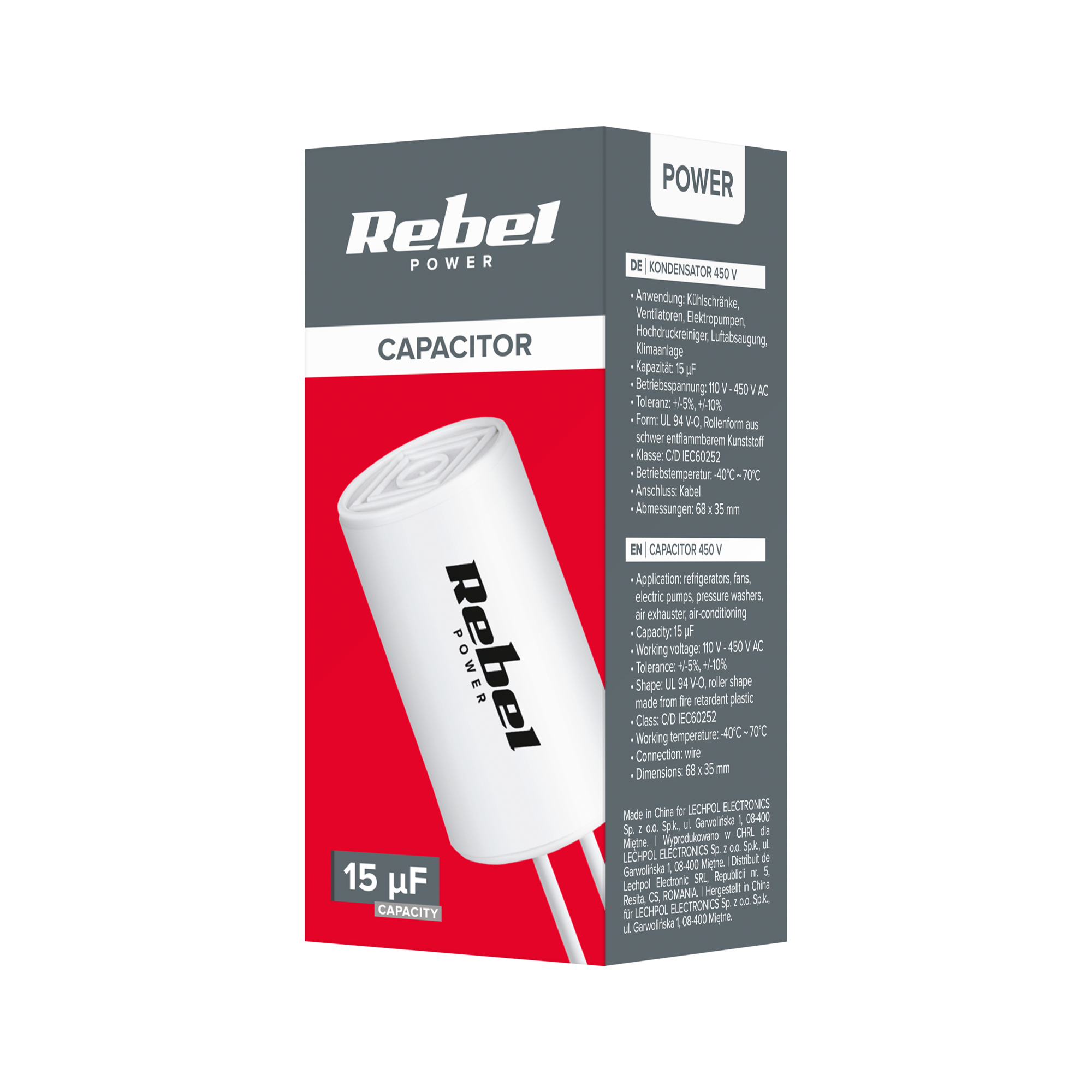 Kondensator o pojemności 15 uF i napięciu roboczym do 450V to niezawodny komponent przeznaczony do pracy w silnikach jednofazowych. Idealnie nadaje się do zastosowań w urządzeniach takich jak lodówki, wentylatory, pompy elektryczne, myjki, wywietrzniki oraz systemy klimatyzacyjne, gdzie niezawodność i trwałość są kluczowe dla stabilnego działania.