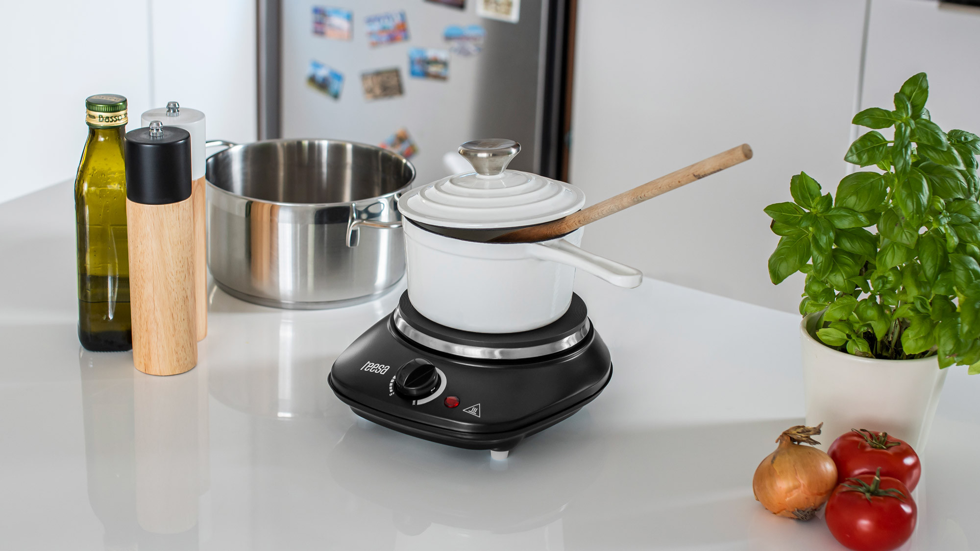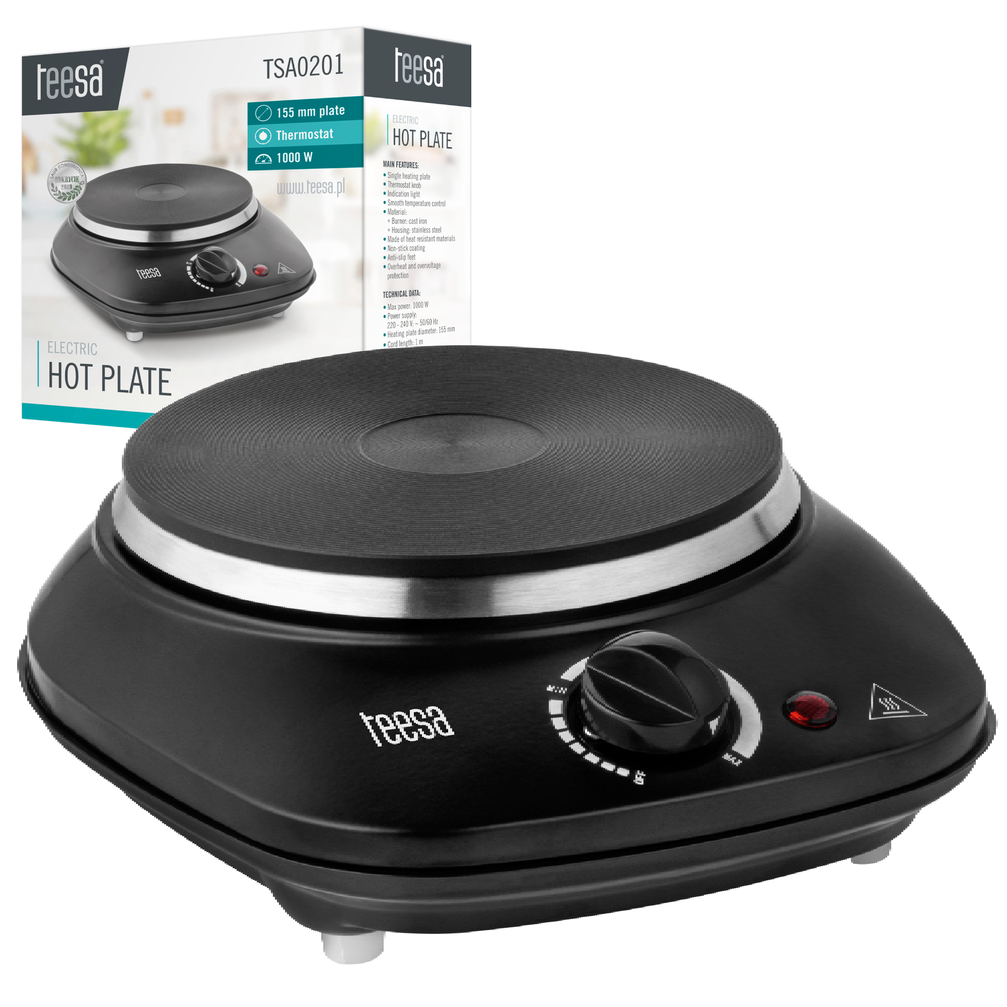 Komfortową obsługę kuchenki turystycznej Teesa zapewnia pokrętło termostatu z lampką kontrolną. O wysokiej jakości przenośnej kuchenki turystycznej Teesa świadczą zastosowane odporne na ciepło materiały. Model TSA0201 wykonany jest ze stali nierdzewnej z nieprzywierającą powłoką, która zdecydowanie ułatwia czyszczenie. Stabilną i bezpieczną pracę gwarantują stopki antypoślizgowe oraz funkcja zabezpieczania przed przegrzaniem i przepięciem.