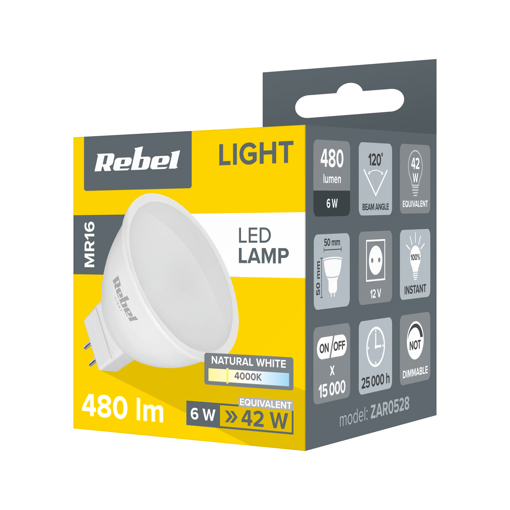 Żarówka LED o mocy 6 W i 480 lm z serii Rebel to gwarancja wysokiej wydajności i niskiego zużycia energii. Charakteryzuje się długą żywotnością oraz szerokim, 120-stopniowym kątem świecenia w naturalnym kolorze. Lampa LED marki Rebel zalicza się do klasy energetycznej G i jest zgodna z ostatnimi rozporządzeniami Komisji Europejskiej dotyczącymi etykietowania energetycznego źródeł światła oraz wymogów dotyczących ekoprojektu dla źródeł światła.