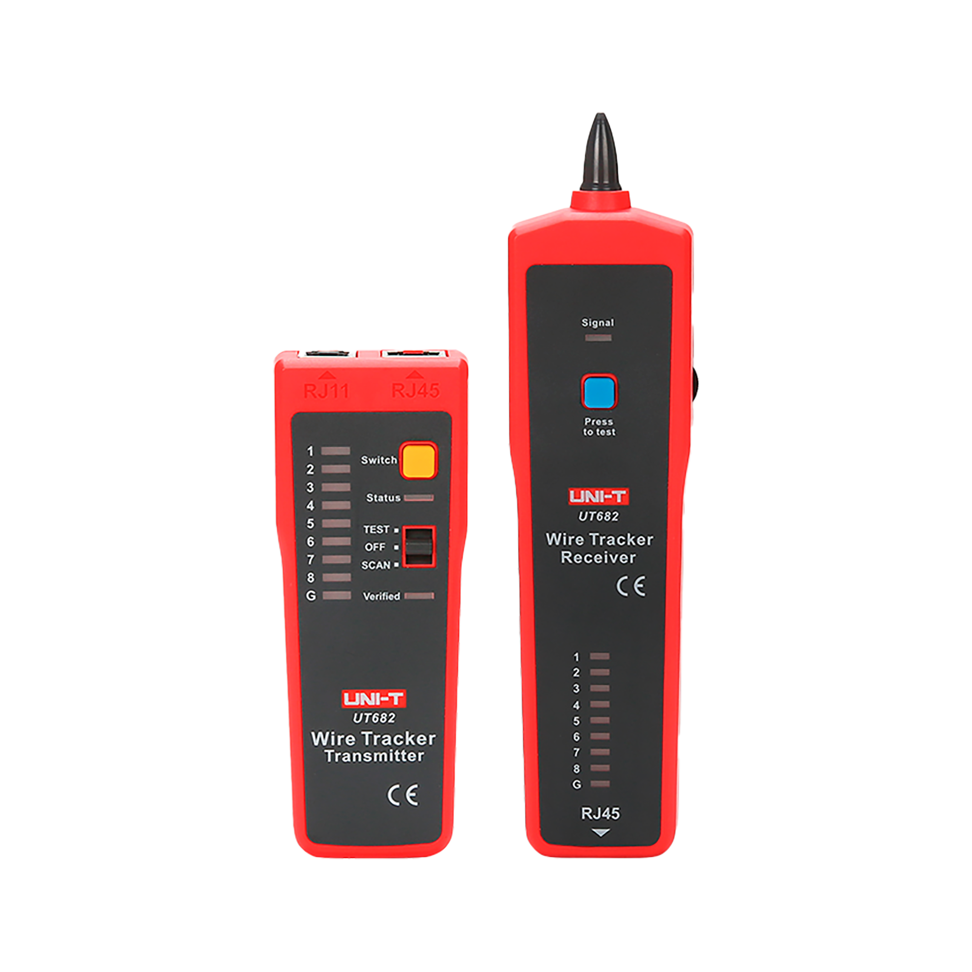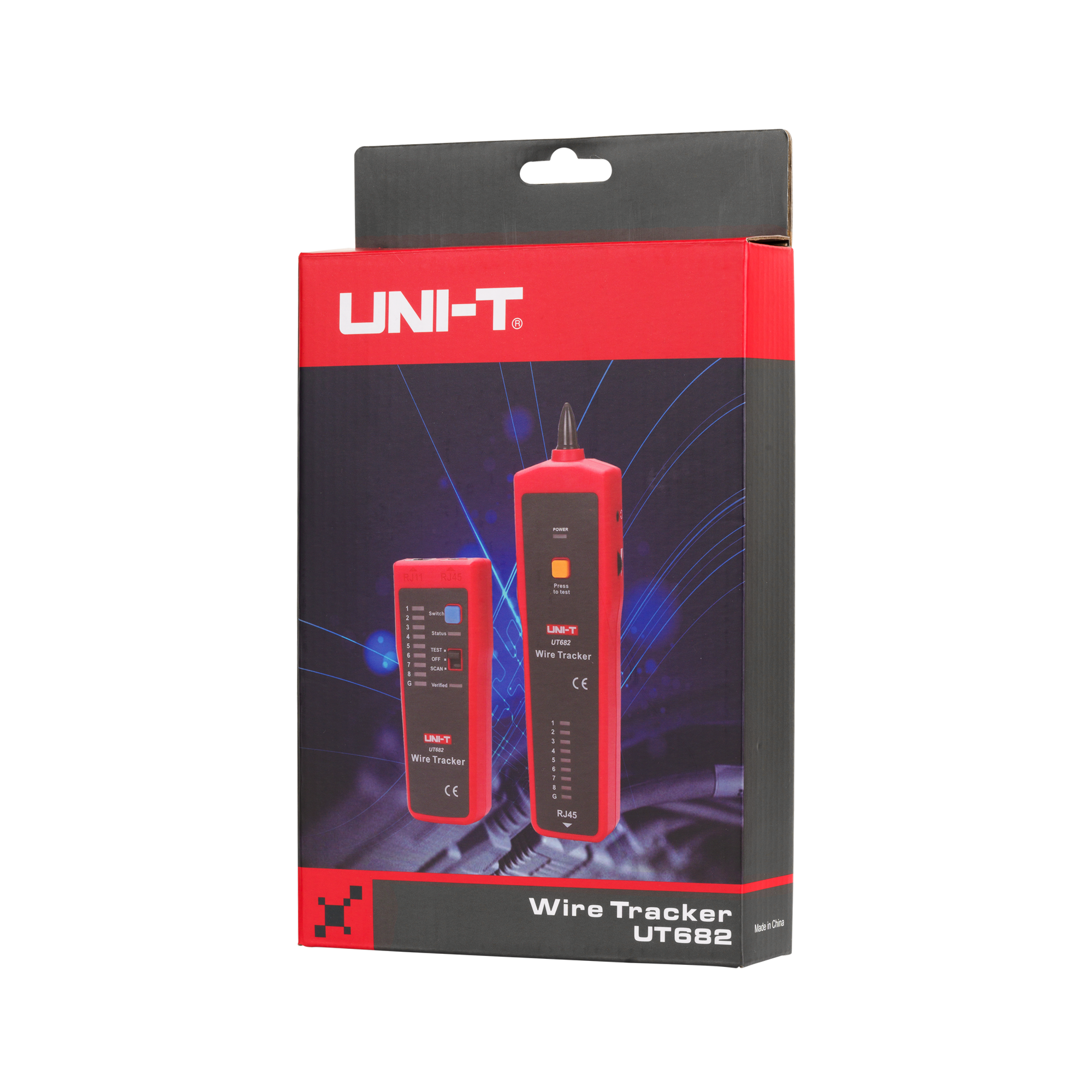 UT682 składa się z transmitera i odbiornika, które są kompaktowe i łatwe do przenoszenia. Transmiter waży 150 g i ma wymiary 74 x 68 x 28 mm, podczas gdy odbiornik waży 130 g i ma wymiary 208 x 47 x 33 mm. Urządzenie zasilane jest bateriami 9 V, co zapewnia długotrwałą pracę. W zestawie znajdują się wszystkie niezbędne akcesoria, takie jak przewody RJ11, RJ45 oraz przewód RJ11 z krokodylkami, a także etui do przechowywania i transportu.