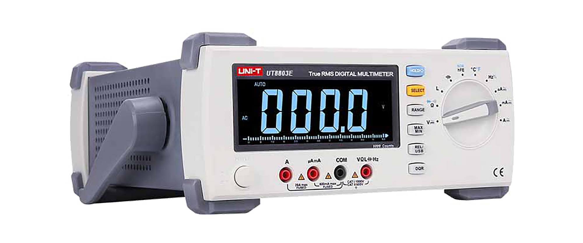 Miernik UT8803E oferuje funkcję True RMS, która zapewnia dokładne pomiary nawet przy zniekształconych sygnałach. Urządzenie wyposażone jest w funkcję automatycznej i ręcznej zmiany zakresów pomiarowych, pomiar wartości względnej oraz zapis wartości MAX/MIN, co ułatwia analizę i śledzenie zmian w obwodach. Dodatkowo, UT8803E umożliwia testowanie diod, tranzystorów hFE oraz tyrystorów SCR, co poszerza jego zastosowanie w diagnostyce komponentów elektronicznych.