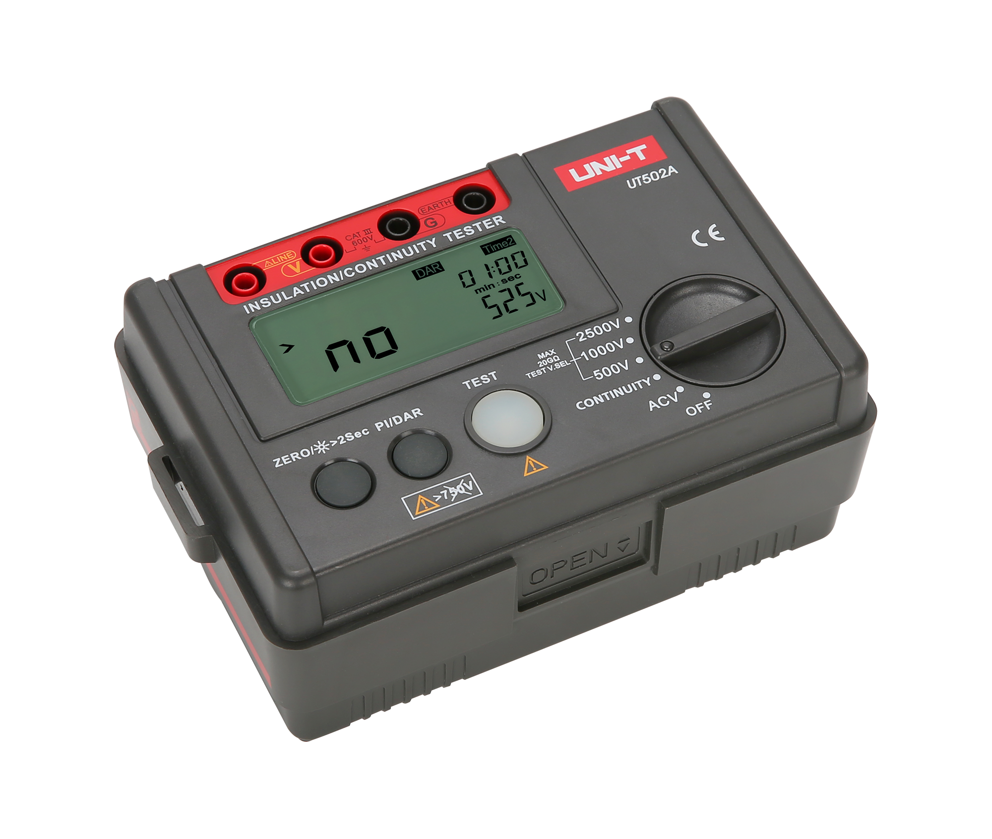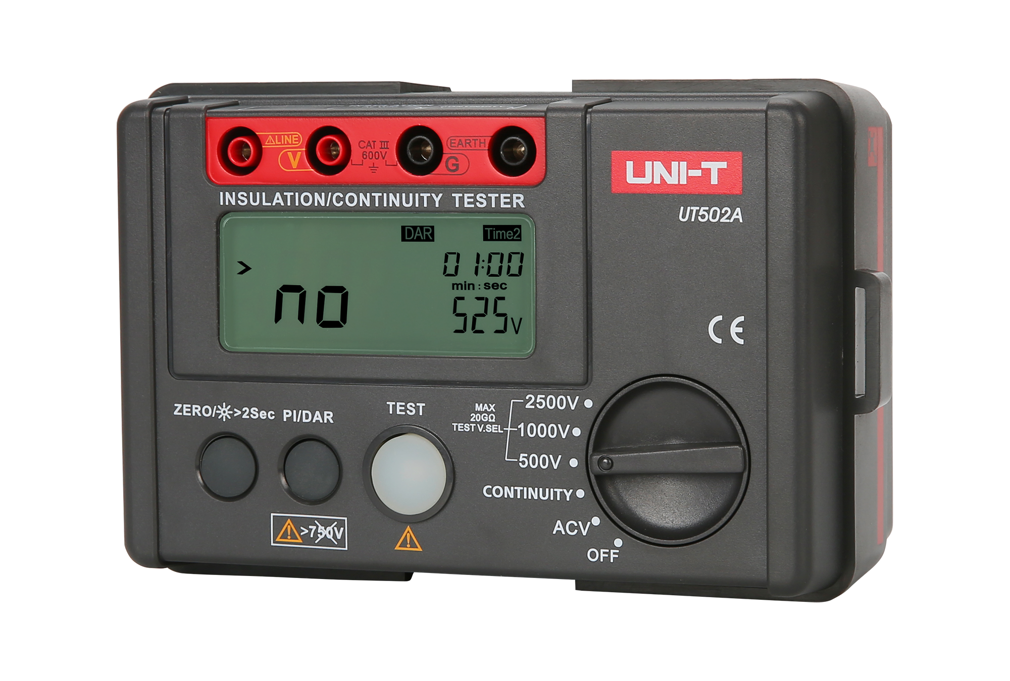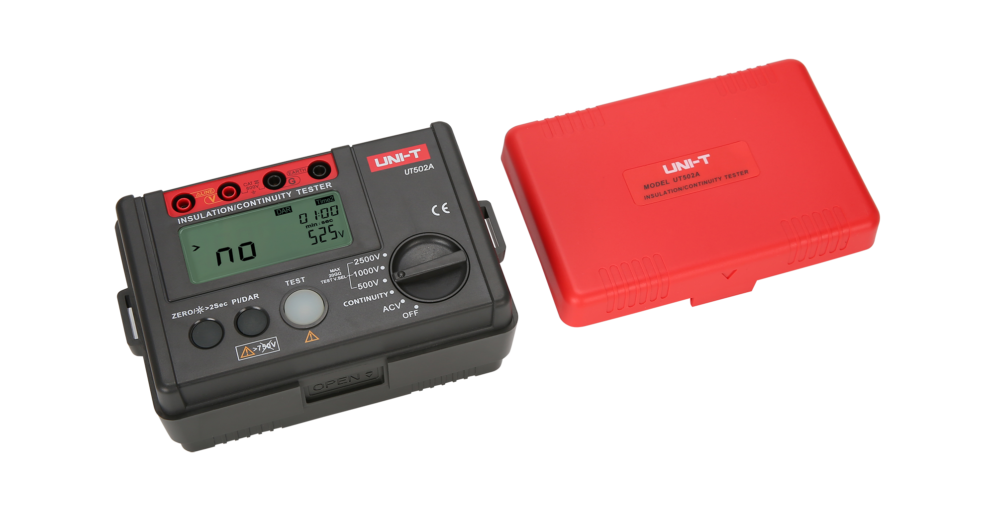 Uni-T UT502A umożliwia pomiar rezystancji izolacji przy trzech różnych napięciach probierczych: 500 V, 1000 V oraz 2500 V. Zakresy pomiarowe są następujące: