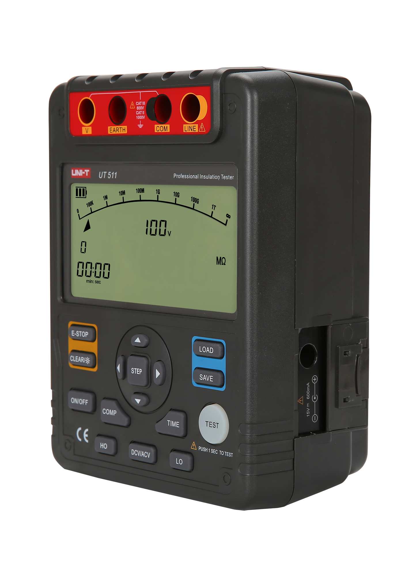 UT511 jest wyposażony w szereg funkcji diagnostycznych, takich jak test absorpcji dielektrycznej, indeksacja polaryzacji oraz funkcja porównawcza, które umożliwiają kompleksową ocenę stanu izolacji. Miernik posiada również funkcję automatycznej zmiany zakresów pomiarowych, wskaźnik niskiego poziomu baterii oraz ostrzeżenie o wysokim napięciu, co zwiększa bezpieczeństwo i wygodę użytkowania. Dodatkowo, podświetlany ekran LCD o wymiarach 123 x 58 mm oraz analogowy bargraf z 30 segmentami ułatwiają odczyt wyników w różnych warunkach oświetleniowych.