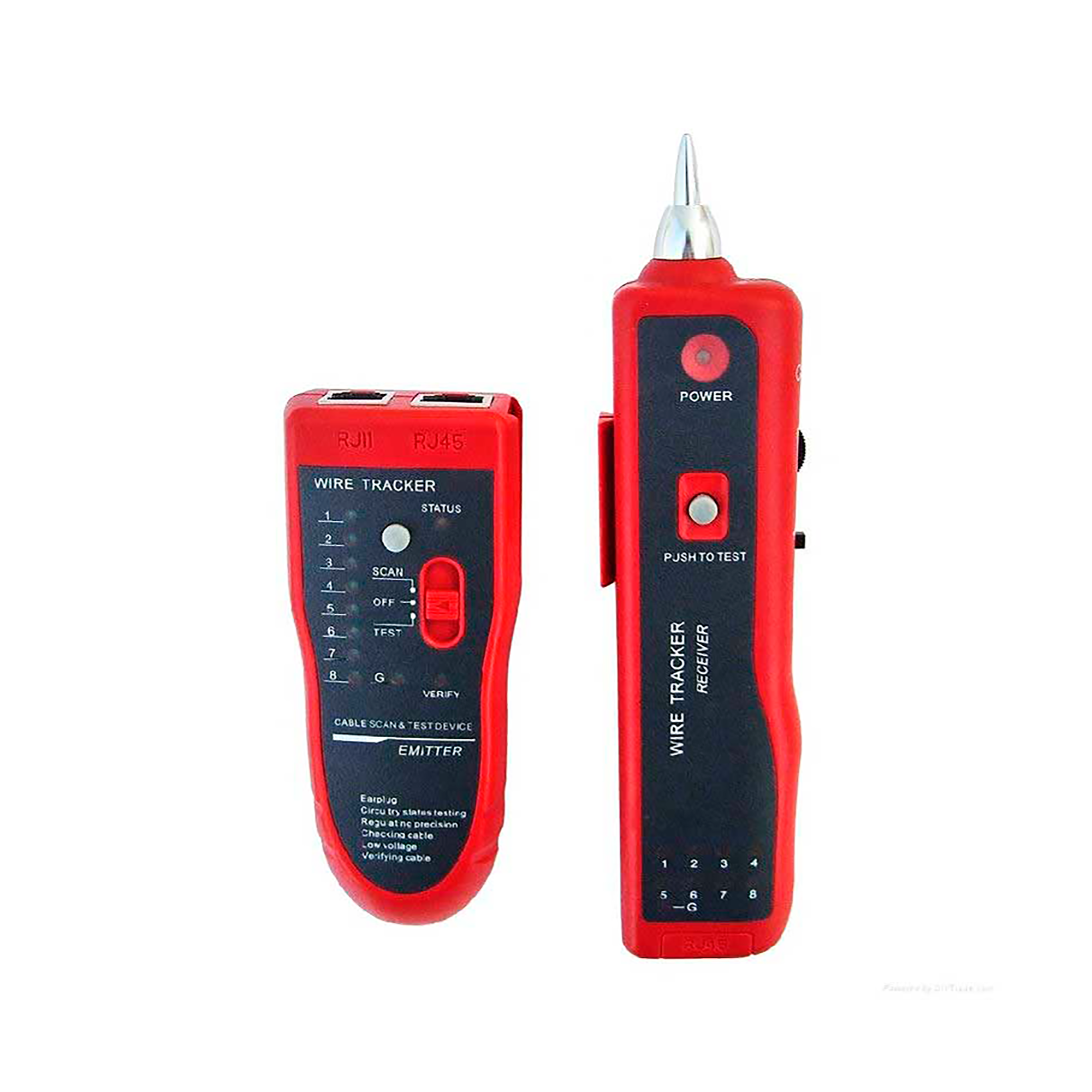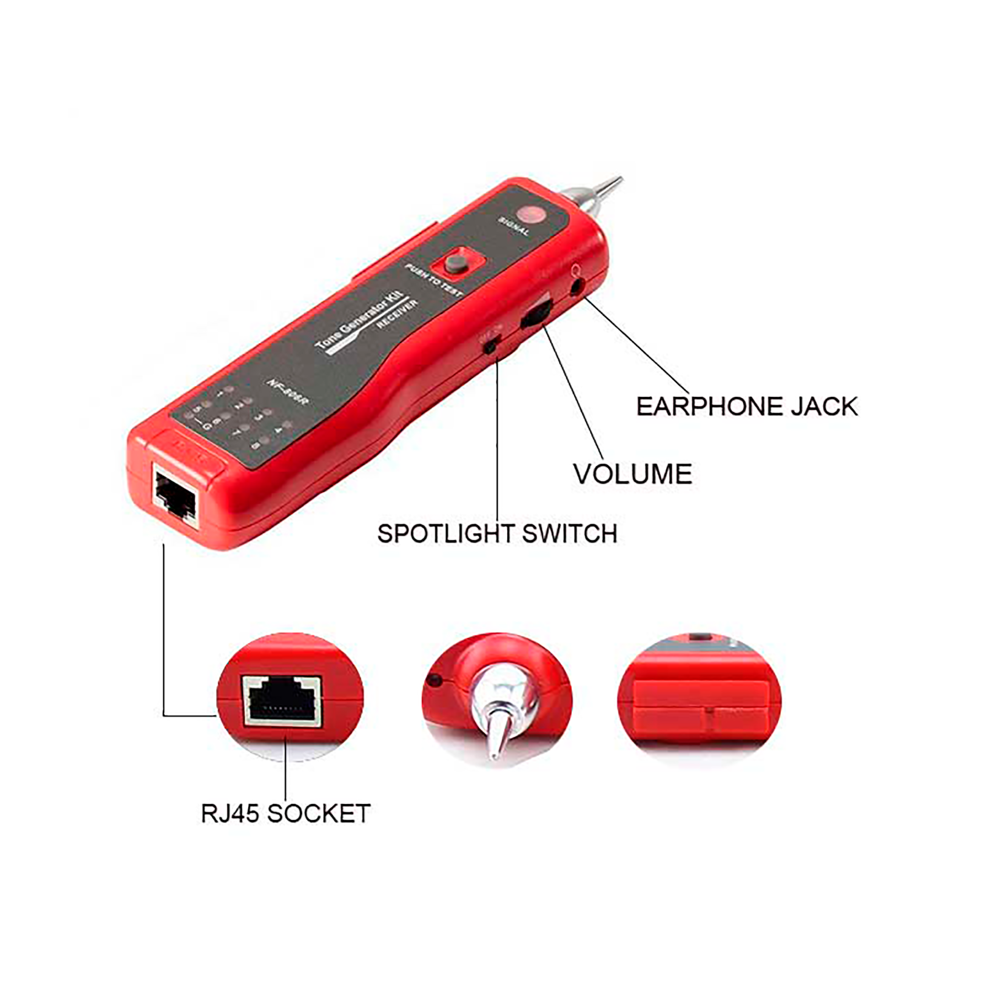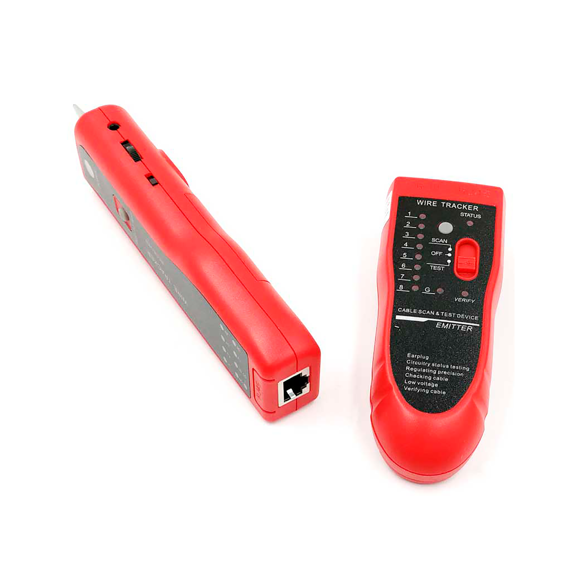 Wysokiej jakości tester sieci – szukacz par przewodów Pozwala na identyfikację przewodów w wiązkach kablowych i wskazywanie kabli przypisanych do poszczególnych gniazd. Poprawność wskazania sygnalizowana jest wyraźnym modulowanym sygnałem dźwiękowym.