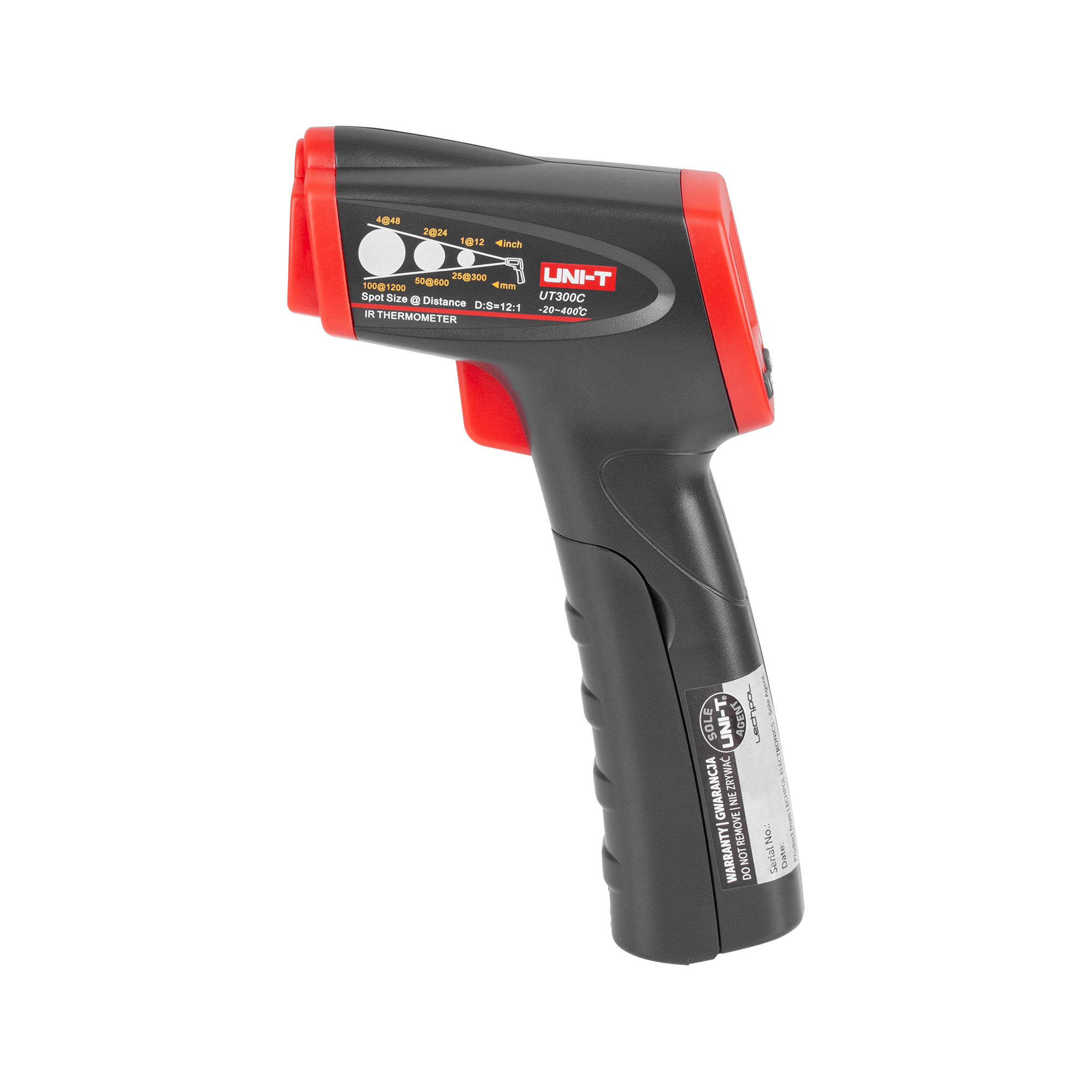 Uni-T UT300S oferuje wygodę użytkowania dzięki szerokiemu stosunkowi odległości do powierzchni testowanej wynoszącemu 12:1, co umożliwia precyzyjne pomiary z większej odległości. Szybki czas odpowiedzi wynoszący 500 ms oraz podświetlany ekran LCD zwiększają komfort pracy w różnych warunkach oświetleniowych. Dodatkowe funkcje, takie jak możliwość zamrożenia ostatniego wskazania oraz wybór jednostki temperatury °C/°F, zwiększają wszechstronność urządzenia.