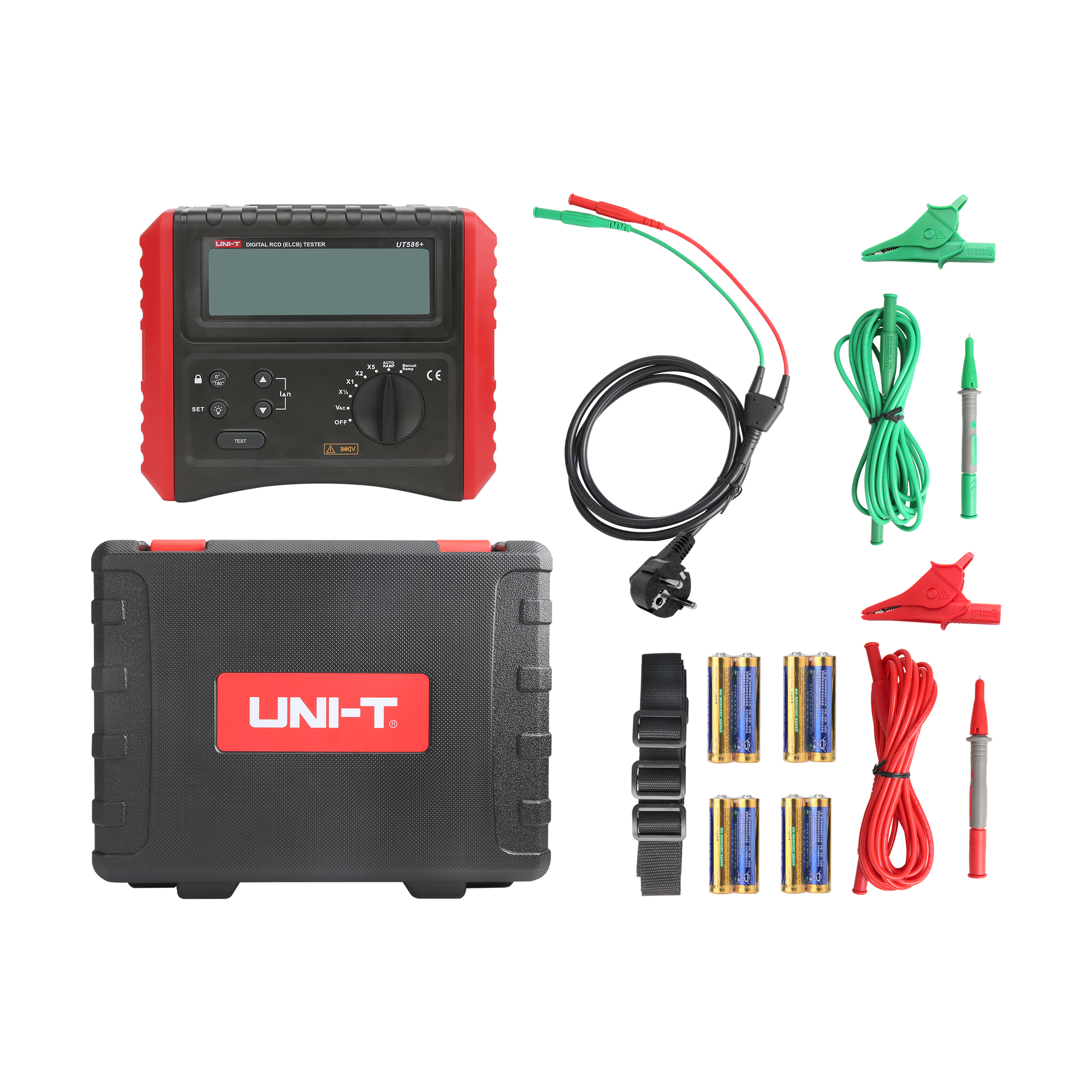 W zestawie: baterie, przewody pomiarowe, specjalny przewód pomiarowy, końcówki pomiarowe, krokodylki pomiarowe, sonda pomiarowa, etui