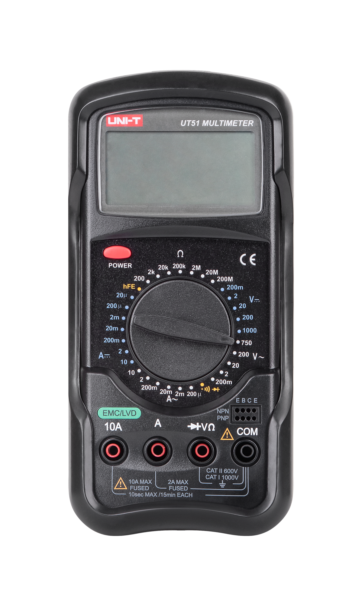 UT51 oferuje rozbudowane możliwości pomiarowe, obejmujące zarówno napięcie stałe (DC) do 1000 V, jak i zmienne (AC) do 750 V. Urządzenie umożliwia także pomiar natężenia prądu stałego i zmiennego, aż do 10 A. Szeroki zakres pomiaru rezystancji do 200 MOhm oraz funkcje takie jak test diod, pomiar hFE tranzystorów i sprawdzanie ciągłości obwodu, czynią z UT51 wszechstronne narzędzie diagnostyczne.