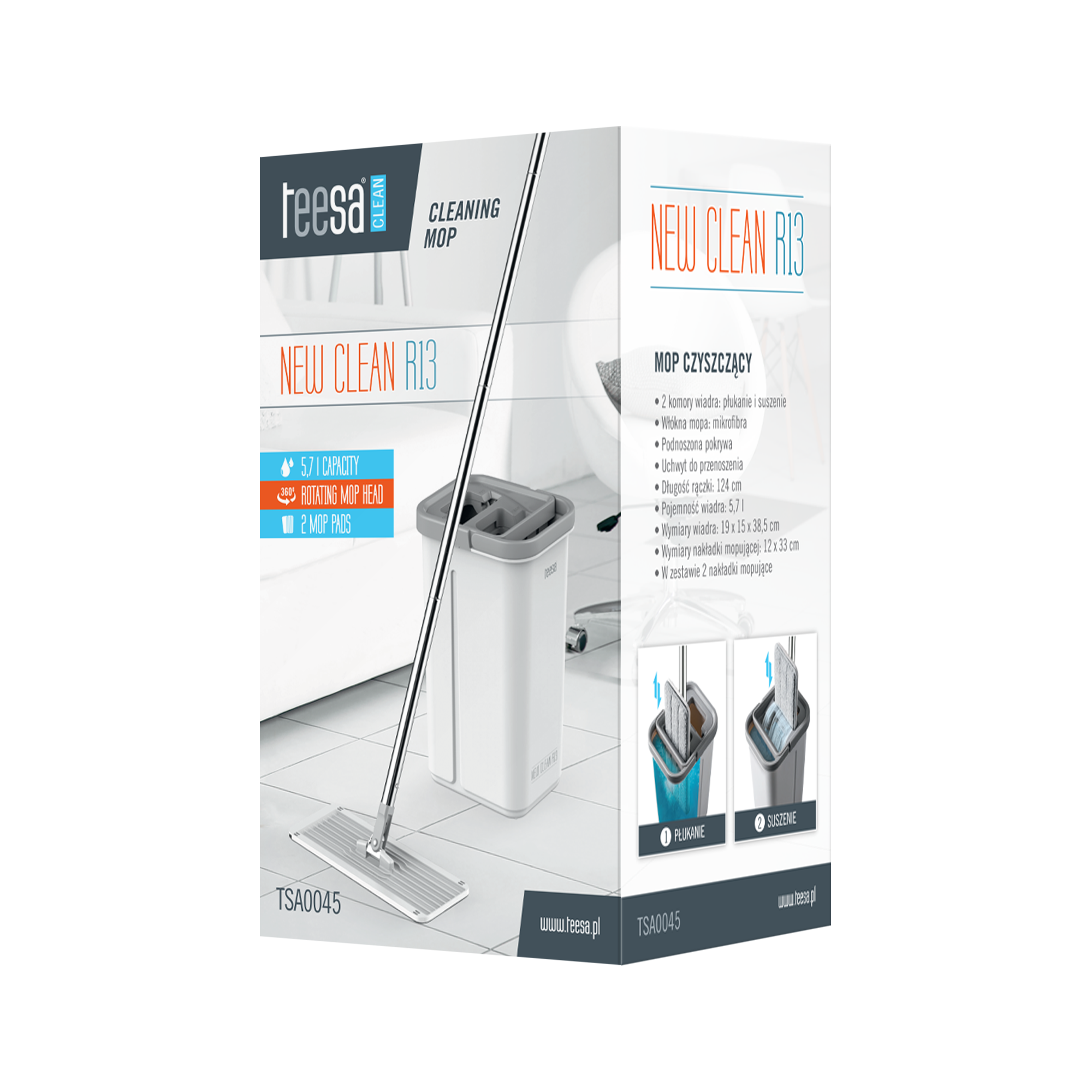 Wygodny, poręczny i niezwykle efektywny! Właśnie taki jest mop z wiadrem dwukomorowym Teesa New Clean 13. Płaska konstrukcja oraz obrotowa głowica sprawiają, że z łatwością zmyjesz podłogę nawet w trudno dostępnych miejscach, np. pod kanapą czy łóżkiem. Co więcej, specjalna budowa wiadra sprawia, że mop nie wymaga użycia dużej ilości wody, dlatego masz pewność, że z New Clean 13 oszczędzasz nie tylko czas, ale także pieniądze.