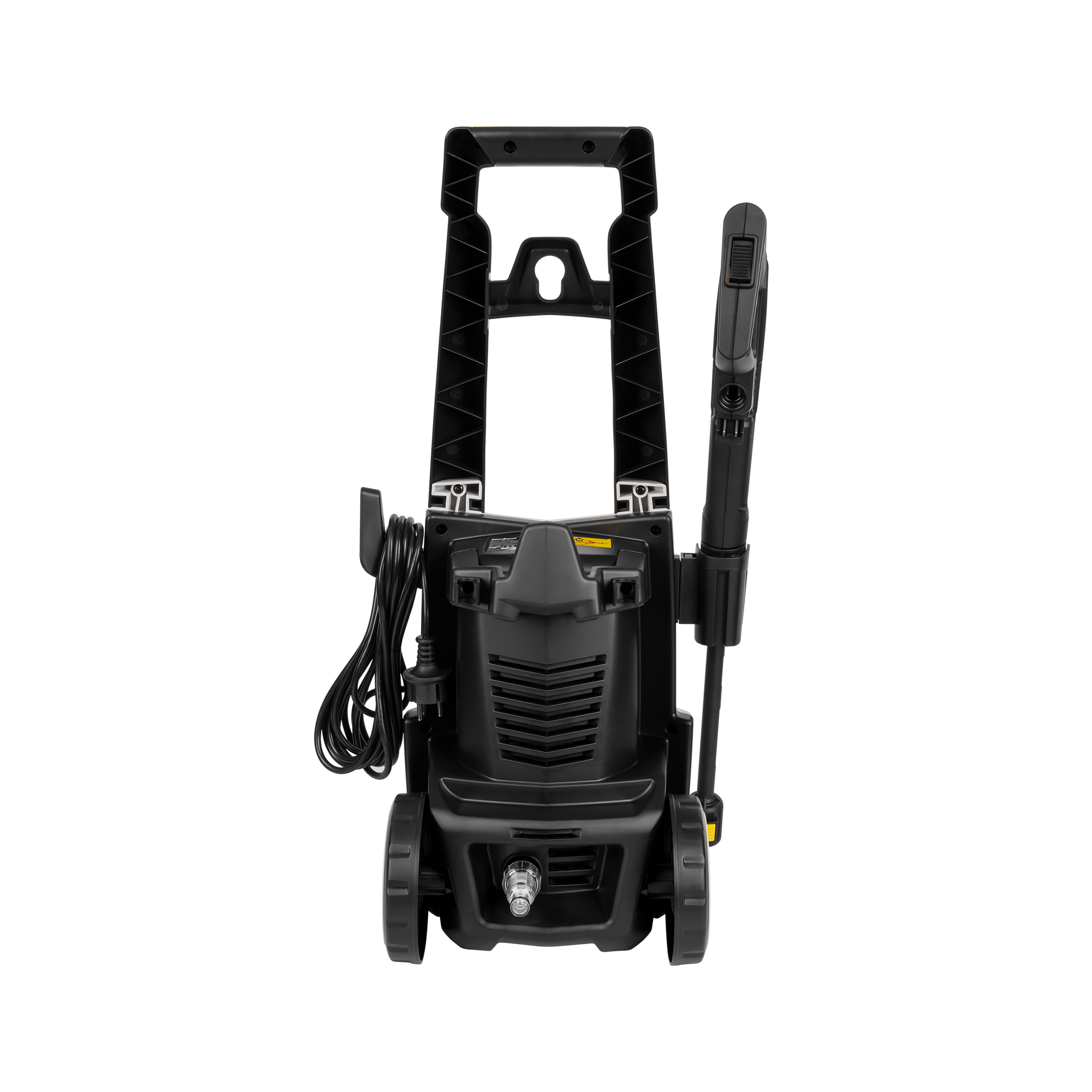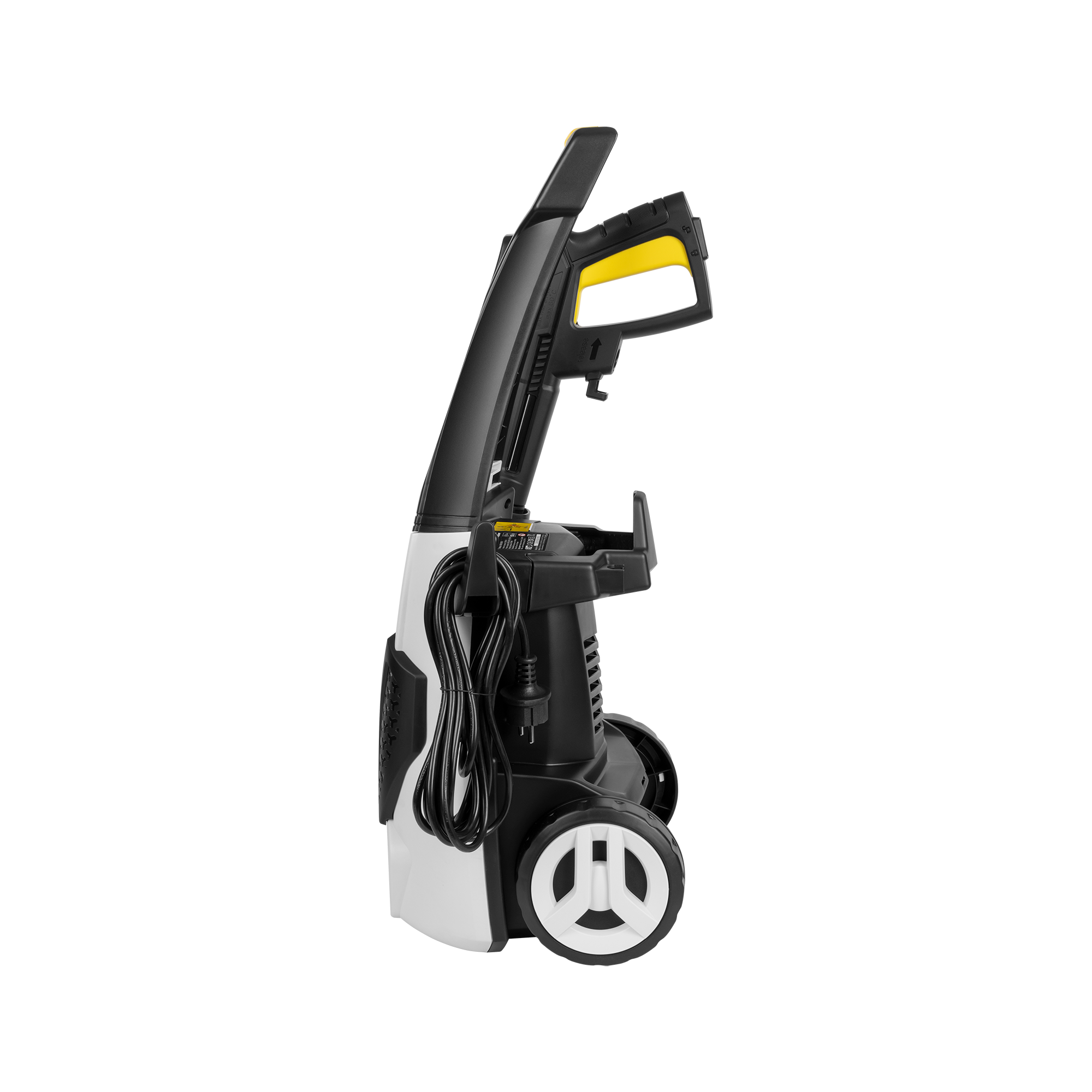Wraz z myjką w zestawie otrzymujesz pistolet, 2 dysze, wąż oraz adapter wejściowy z filtrem. W obudowie urządzenia zastosowano natomiast wygodne uchwyty, na których możesz bez problemu zwinąć wąż i kabel zasilający. Z kolei przechowywanie lancy ułatwi specjalnie do tego przeznaczony schowek.