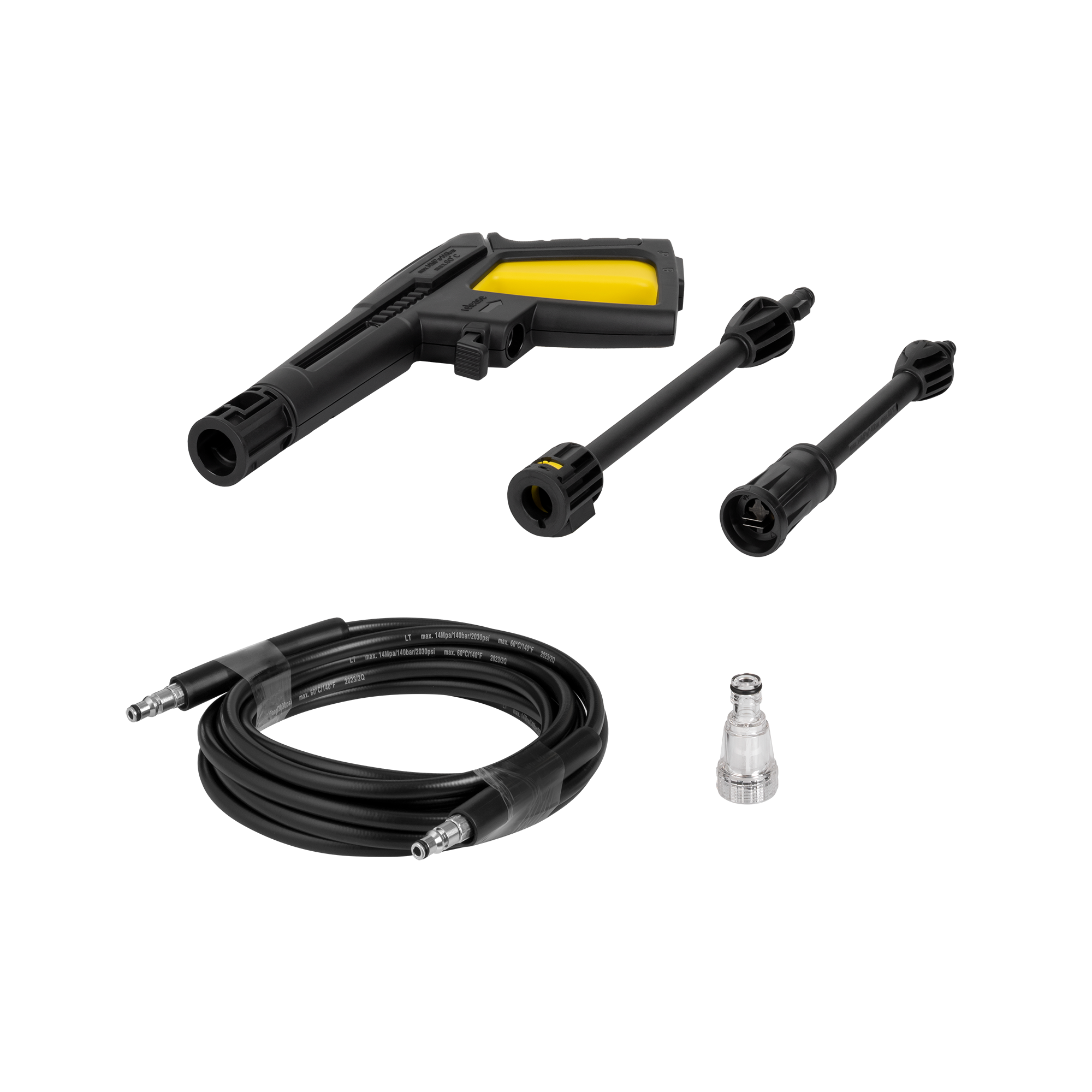 W zestawie: pistolet, lanca przedłużająca, lanca z regulowaną dyszą, wąż, adapter wejściowy z filtrem