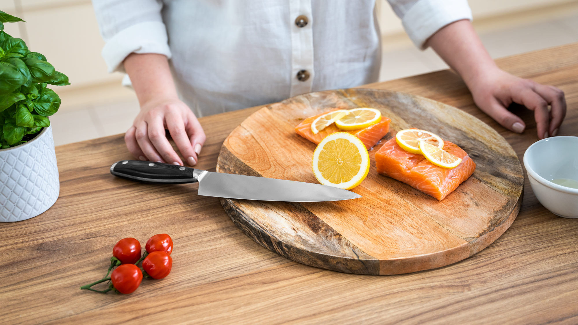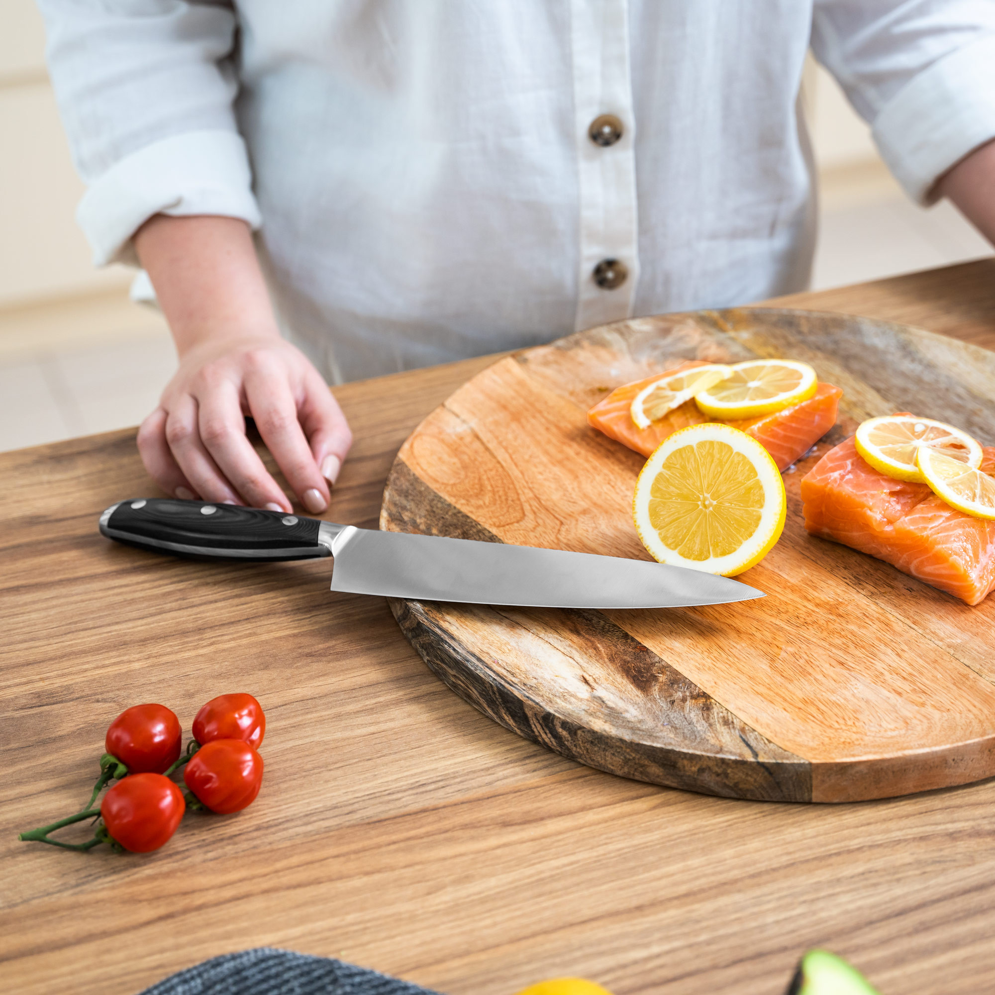Lubisz zaskakiwać rodzinę i znajomych nowymi potrawami? Dobry nóż szefa kuchni to absolutny niezbędnik w Twojej kuchni. Charakterystyczne dla tego typu noży kuchennych jest długie, szerokie i doskonale wyprofilowane ostrze, które sprawia, że są one bardzo uniwersalne. Z łatwością pokroisz zarówno mięsa, ryby, jak też warzywa czy zioła.