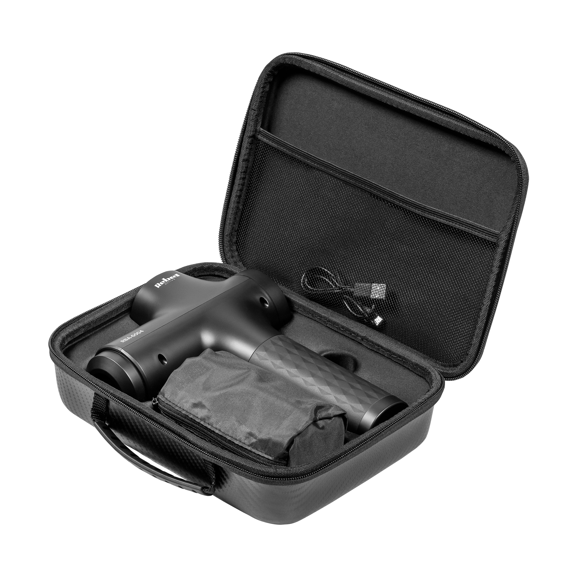 W zestawie z masażerem Rebel otrzymasz solidne etui, które pozwala na wygodne przechowywanie i transport urządzenia. Dzięki temu możesz mieć pistolet masujący zawsze przy sobie – w domu, w pracy, czy na siłowni.