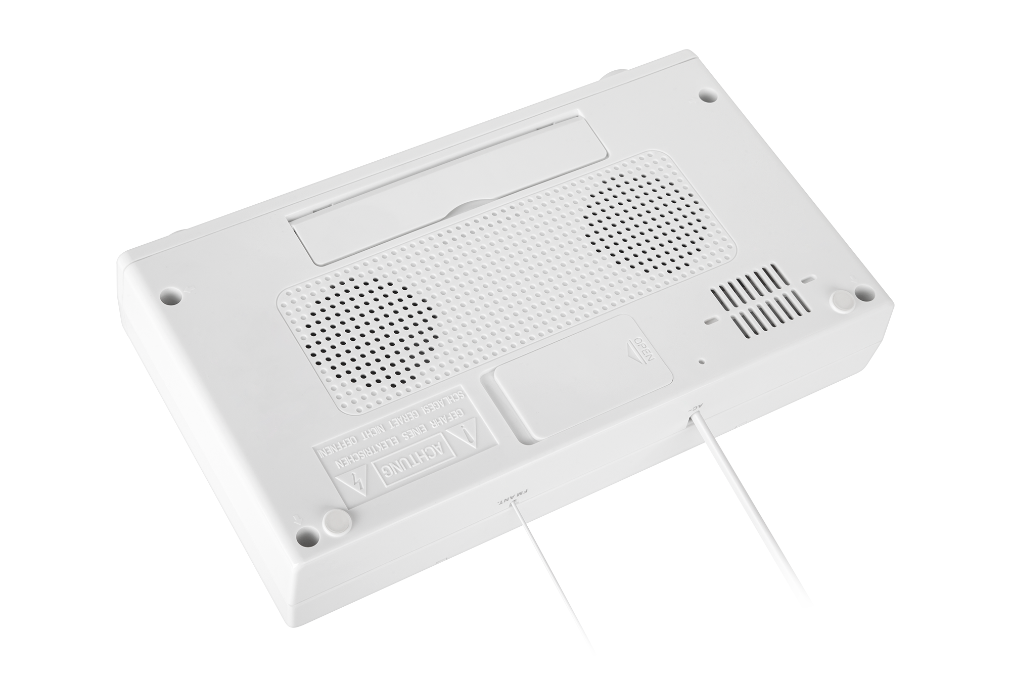 Zasilanie bateriami: 2x baterie AA (niedołączone do zestawu; zasilanie bateriami służy tylko do podtrzymania pamięci zegara i alarmu w czasie przerwy w dostawie prądu)