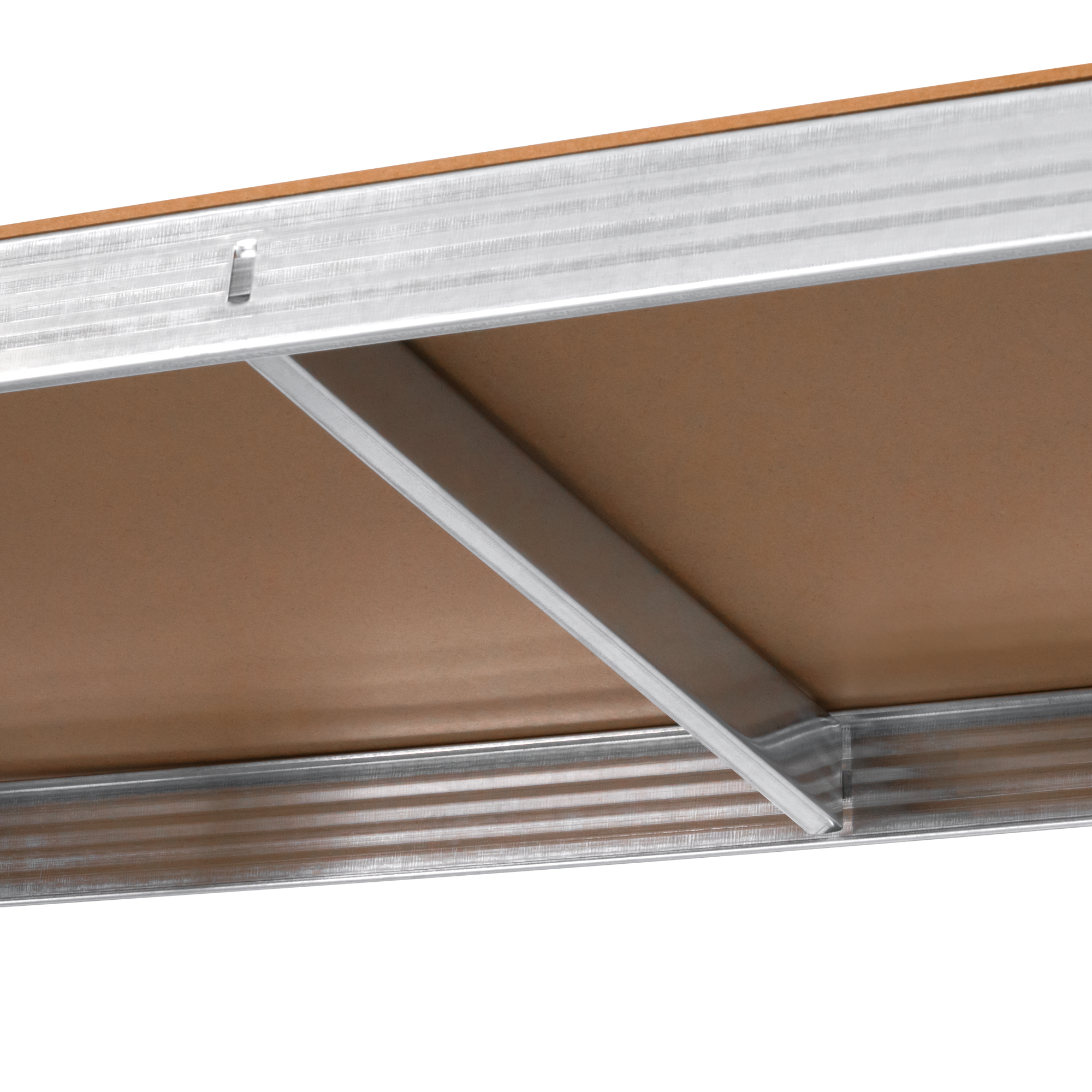 Regał warsztatowy z serii Rebel Tools dzięki solidnej konstrukcji z ocynkowanej stali i jest przystosowany do przechowywania zarówno lekkich jak i ciężkich przedmiotów. Wyposażony został w 5 mocnych półek, a każda z jest w stanie wytrzymać obciążenie 150 kg. Aby zminimalizować ryzyko usterki regału rozkładaj na półkach ciężar równomiernie.